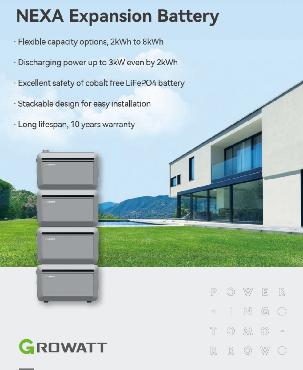 Die Growatt Nexa Erweiterungsbatterie 2000 Wh für Balkonkraftwerke ist ein Batteriemodul zur Erweiterung eines Growatt Nexa Speichersystems und erhöht die Speicherkapazität um 2 kWh. Sie nutzt kobaltfreie Lithium-Ionen-Phosphat-Technologie (LFP) und arbeitet mit 51,2 V Nennspannung. Die Installation erfolgt per Plug & Play über ein modulares Stecksystem und ist als Bodeninstallation vorgesehen. Leistungsdaten: Entladeleistung 3 kW, max. Entladungsstrom 60 A, max. Ladekapazität 2 kW, max. Ladestrom 40 A. Schutzklasse IP65, Maße 406 x 235 x 270 mm, Gewicht 20 kg. Das System ist modular von 2 bis 8 kWh erweiterbar, mit bis zu drei zusätzlichen Batteriemodulen bis zur maximalen Gesamtspeicherkapazität von 8 kWh. Lieferumfang: 1x Growatt Nexa Erweiterungsbatterie 2000 Wh, Garantie 10 Jahre.