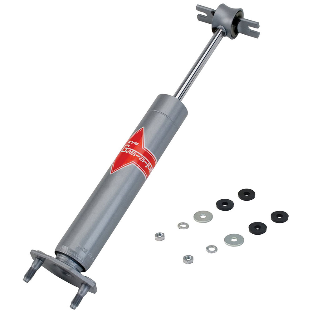 Electronic safety systems depend on the suspension, brakes and tires operating as the vehicle manufacturer intended. The KYB Gas-a-just helps keep Electronic Safety Systems performing as designed.; The higher gas pressure of the KYB Gas-a-Just responds quickly to improve steering response; Fluid leaking can be a cause of shock failure, the KYB Gas-a-just has an ultra-smooth triple chrome plated chrome piston rod to reduce seal wear; High pressure monotube design separates the gas and oil for fade free operation and instant response; Gas-a-Just monotubes include additional damping over OE design for vehicles that work, tow, and have larger, heavier tires & wheels; Components and valving designed specifically for classic Ford cars; Adds up to 25% more damping performance over original equipment shocks; Lower Mount Type - Special; Upper Mount Type - E3(51.6x82x0); B-stop - N; Internal Rebound Spring - N; R-stop - Y; Dust Cover Included - N; Stroke Length - 4.41; Compressed Length - 9.61; Extended Length - 14.02
