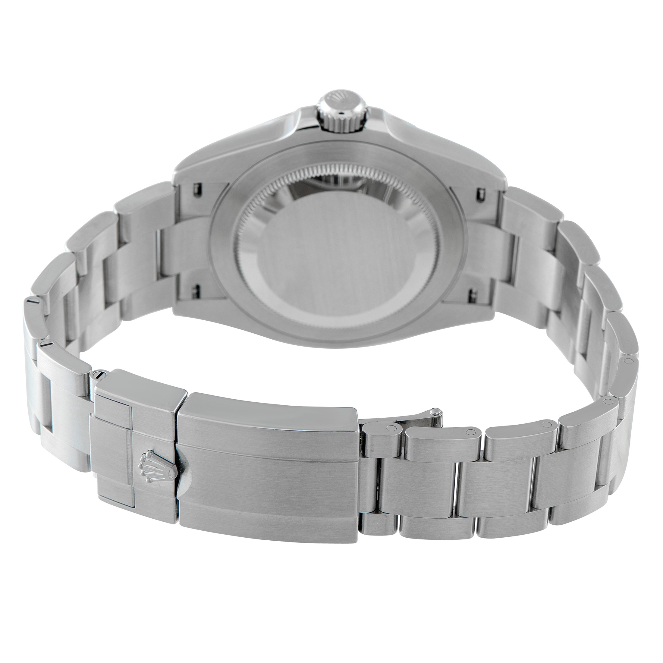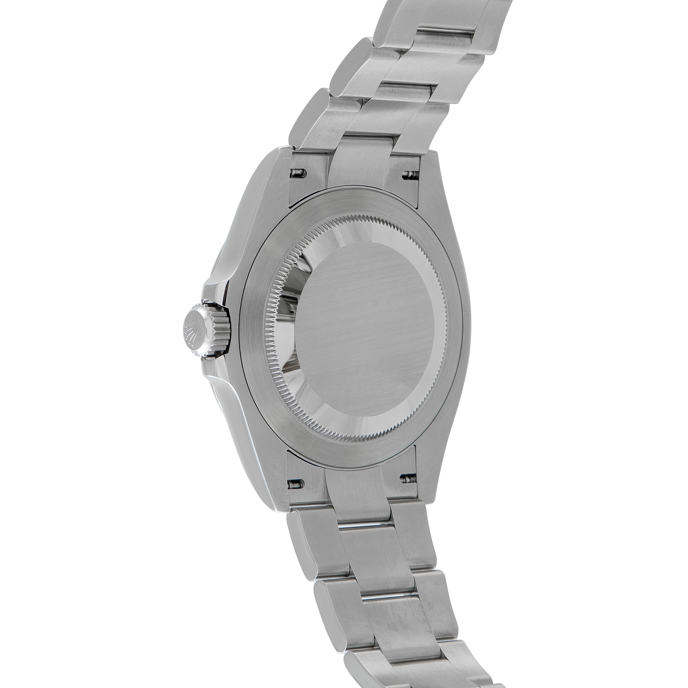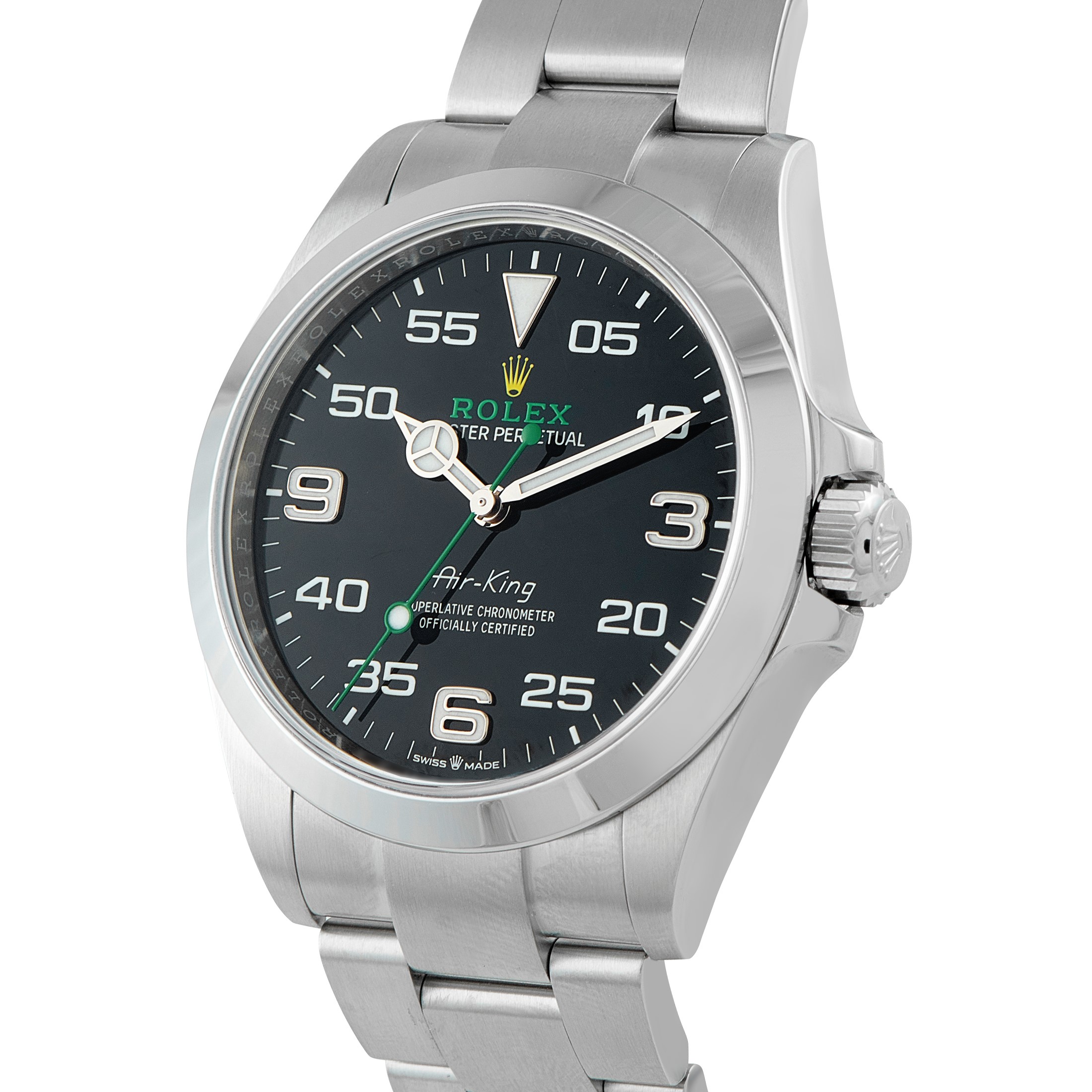 Not the obvious choice, and that is precisely the point. Collectors gravitate to the Air-King because it resists predictability. The Rolex Air-King ref. 126900 features a black dial combining large 3-6-9 numerals with a prominent minute scale calibrated in five-minute increments. The green seconds hand and logo introduce color in a way few other references attempt. The 40mm Oystersteel case includes crown guards, aligning it visually with the broader sports family while preserving its aviation identity. Powering this reference is Caliber 3230, delivering Superlative Chronometer certification and a 70-hour reserve through its efficient Chronergy escapement.This is a pre-owned Rolex Air-King Oystersteel Watch 126900, accompanied by papers and the manufacturer's box.