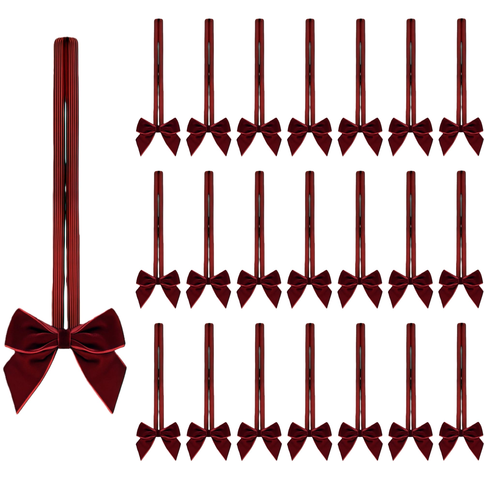 you will receive total 24 pieces of burgundy pre-tied velvet ribbon bows with 10 inch burgundy elastic bows for gift boxes,the pre-tied ribbon bows measures about 4 x 4 inches,10 inch stretch elastic loops can be stretchy to approx 25-62.5cm/ 10-25 inches. Elevate holiday or everyday gift wrapping with pre-tied bulk christmas bows, each featuring a matching elastic loop adds refined texture and festive charm to gifts, crafts, or Christmas tree décor Notes: Manual measurement, please allow slight errors on size. The color may exist a slight difference due to different screen displays. Please measure the size before placing an order.