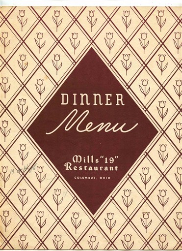 A large 4 page menu. Mills "19" Restaurant Dinner Menu. located in Columbus Ohio, circa 1950's. Measures about 8 3/4" x 11 1/4" when closed.