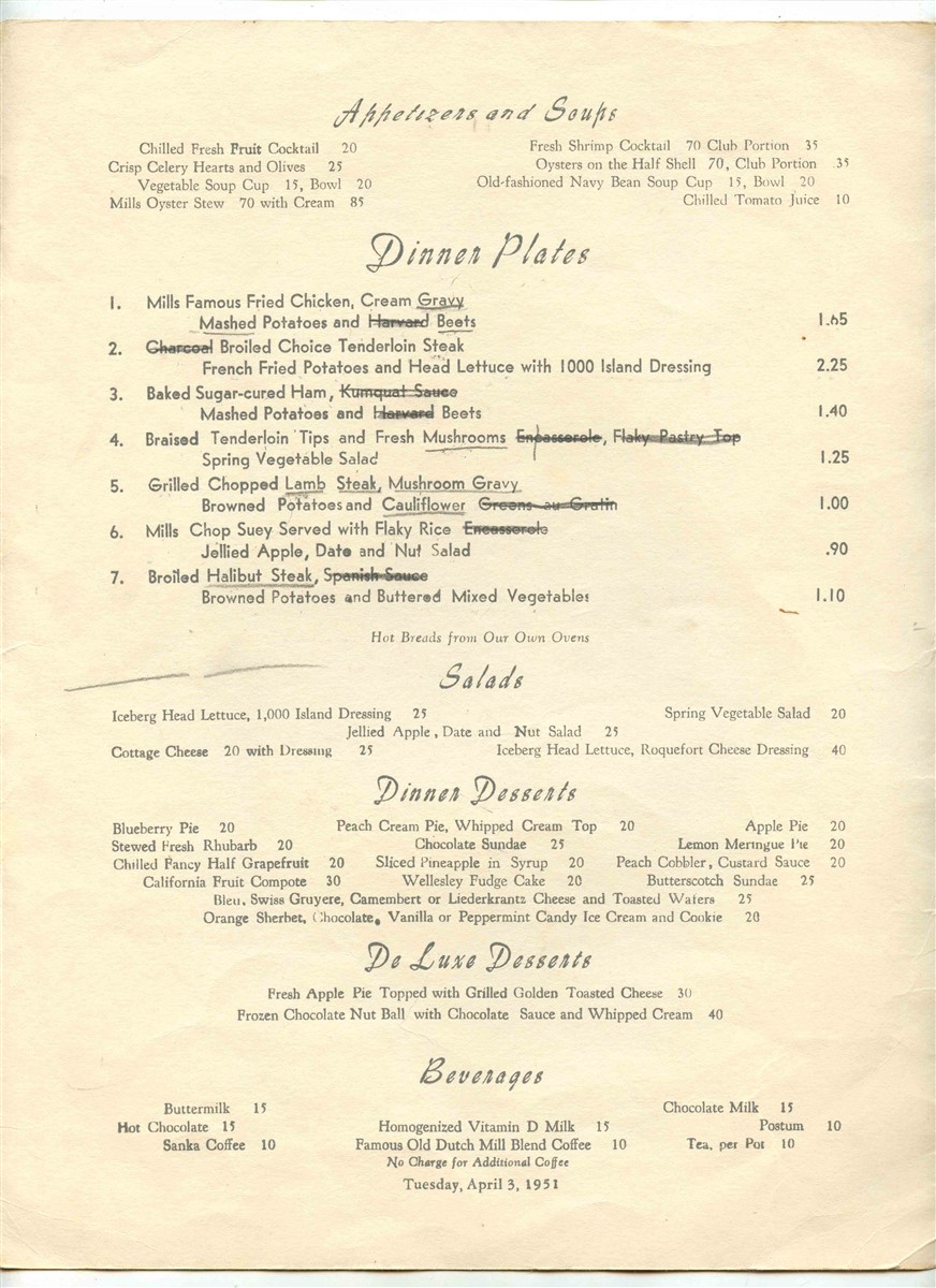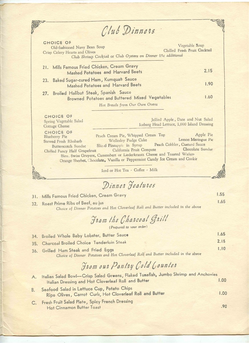 Mills "19" Restaurant Dinner Menu Columbus Ohio 1950's