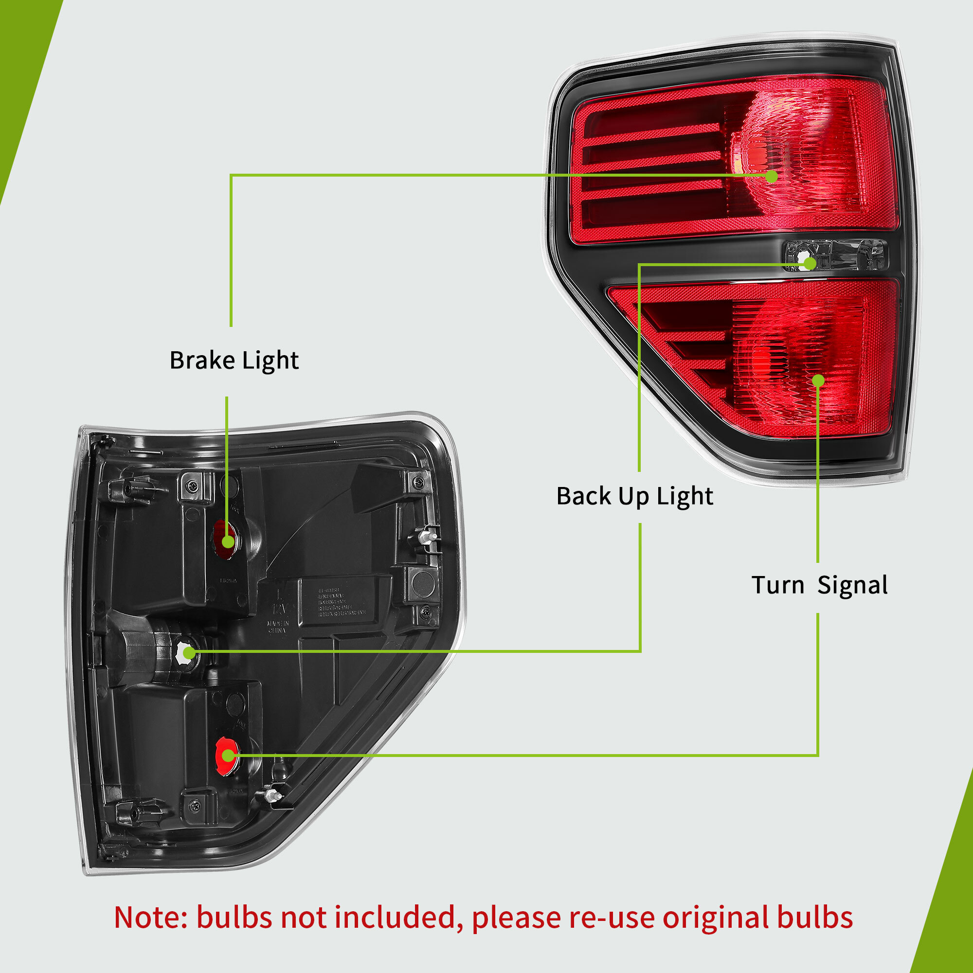 - Made of high quality OEM grade ABS plastic and polycarbonate lens to keep moisture and dust out of the tail light housing.