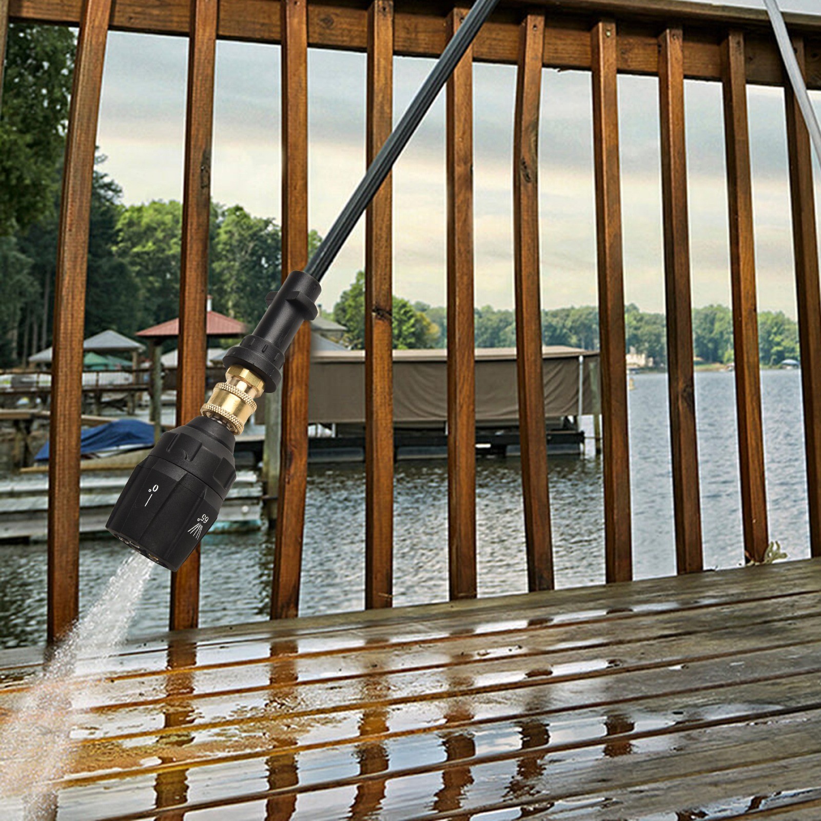 Caractéristiques : *Pistolet de nettoyage haute pression à 5 en 1 facile à pour transporter et ne prenant pas beaucoup d'espace pour le rangement, vous faisant gagner du temps et de l'énergie plus rapidement et plus facilement de stocker et chercher des buses séparées. *La tête de buse à 5 en 1 a une utilisation très polyvalente et pratique. Il suffit de tourner la tête de la buse et vous pouvez nettoyer instantanément les trottoirs en béton, les marches, les terrasses en bois, les murs, les abris et les voitures. *Raccord mâle rapide connecteur de 1/4 : La buse rapide insérée de 1/4 de pouce est adaptée aux différents types de machines de nettoyage. *Buse à haute pression multifonctionnelle à 5 en 1 - Une seule tête de buse avec pour cinq angles différents : 0°, 15°, 25°, 40°, 65° (tournez pour changer les angles). *Utilisations multiples - L'adaptateur de machine de nettoyage haute pression convient au nettoyage de voiture, fenêtres, allée menant à la maison, toit, panneaux de mur, jantes de voiture, difficiles à atteindre, évier, sol, grande de nettoyage, arrosage d’arbres . *Matière résistante - Cet Adaptateur de connexion rapide pour machine de nettoyage haute pression est pour fait de cuivre de haute qualité et plastique ABS, avec une pression de travail jusqu'à 4000 psi.