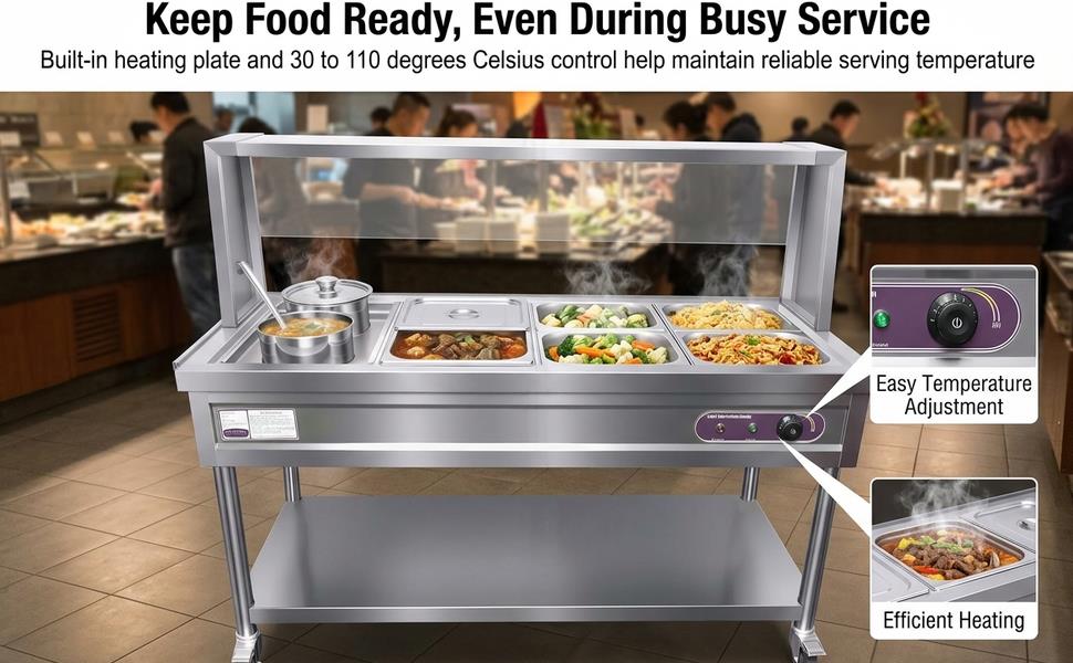 Commercial Food Warmer, 5 Pans + 2 Pots Electric Steam Table, 2500W Professional Buffet Catering Food Warmer with Shield Undershelf Wheels, Stainless Steel Server for Party Restaurant Hotel MoreDetails: 【EFFICIENT HEATING PLATE FOR RAPID, EVEN WARMING】 This food warmer features a built-in heating plate designed for fast and uniform heat distribution. Reliable thermal cycling performance keeps dishes consistently warm across the entire tray area during busy service periods.