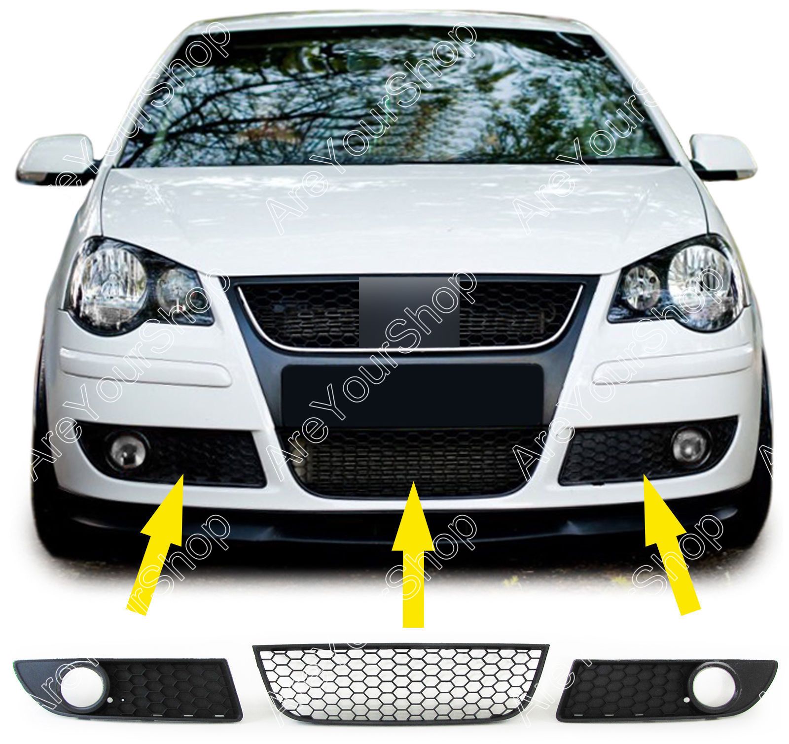 One Front Center Lower Bumper Grille + One Pair Fog Light Grille