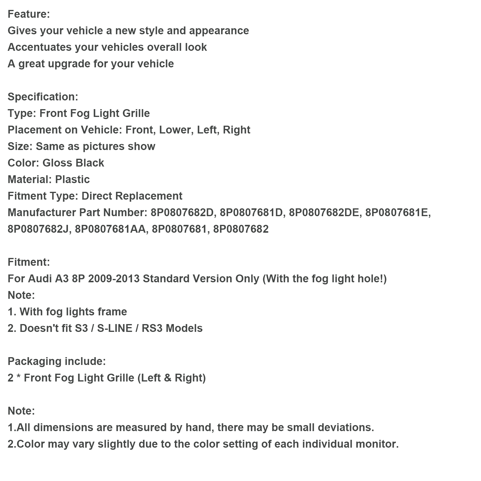 For Audi A3 8P 2009-2013 Standard Version Only (With the fog light hole!)