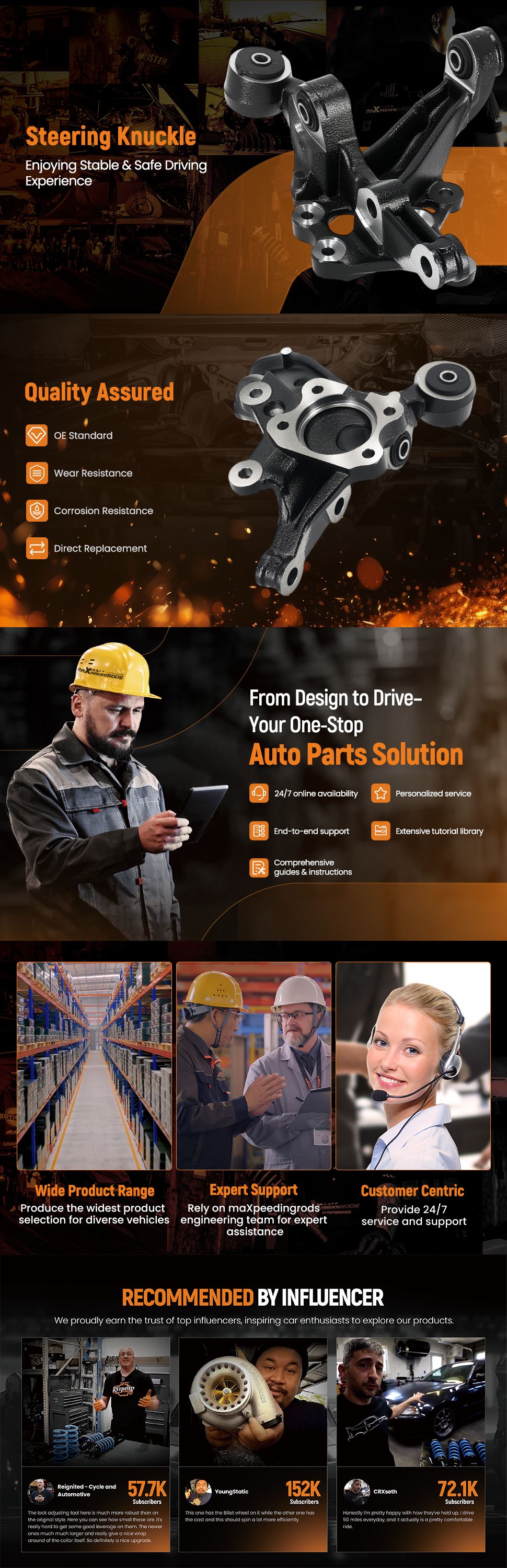 ● Direct replacement: The steering knuckle assembly is used to help solve the following problems: ① braking difficulties ② wheel rotation difficulties ③ excessive tire wear / uneven tire wear④ wheel vibration and wobble ⑤ abnormal noise
