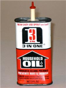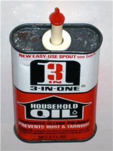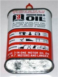 Up for auction is a Vintage “3-in-One Household Oil” Advertising Tin Can! This is a vintage 3 oz. metal oil can (tin) with red, black and white lithography. The tin has great advertising graphics featuring the 3-in-One Oil logo on its front and back. This oil can was made by Boyle-Midway, Inc. and features the “New Easy-Use Spout” introduced in 1968! The tin can measures about 4⅛” tall x 2¼” wide x ⅞” deep (overall 5⅛” tall to top of spout). The oil can is basically empty with a little vintage oil inside. As shown in the photos, this vintage container is in very good condition for its age with nice bright colors and sharp details. It has some normal surface wear, including a few small marks, scuffs or scratches, and light dents or dings that you would expect for such an old used tin container. The top has some light soiling and surface oxidation, and the bottom is still mostly shiny as shown. The oil can has its white spout and red tip in place. This vintage “3-in-One Household Oil” advertising tin can would make a great addition to your collection!