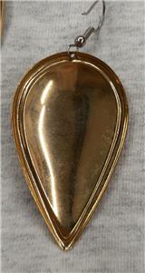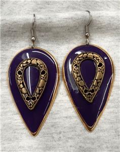 This interesting and unusual pair of mid-to-large-sized goldtone PIERCED earrings are made in inverted teardrop shape. They have a shiny purple violet enameled finish. The centers shine with a textured brasstone inset that gives them charm and character. The back have a plain shiny finish. They are a larger pair, measuring 1 1/4 inches wide and 2 1/4 inches long. They have surgical steel shepherds posts.