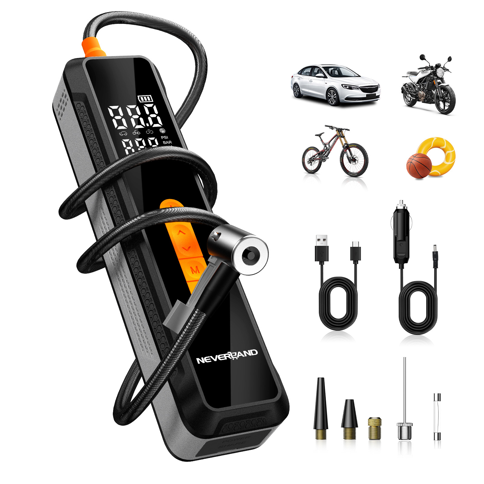 A4: NEVERLAND tire inflator portable air compressor comes with different nozzles. When inflating different objects, you can choose the corresponding nozzle and mode for inflation.