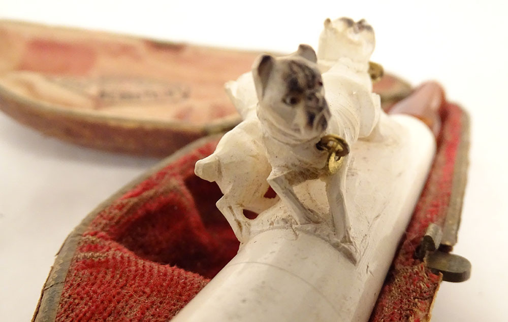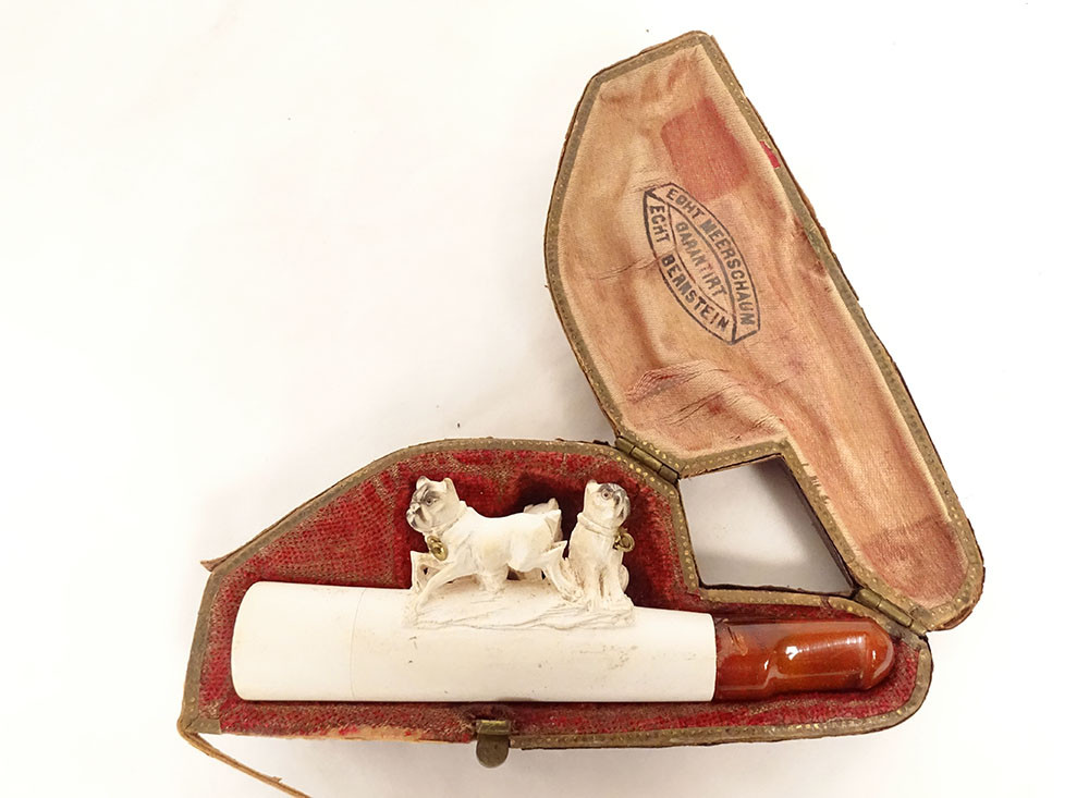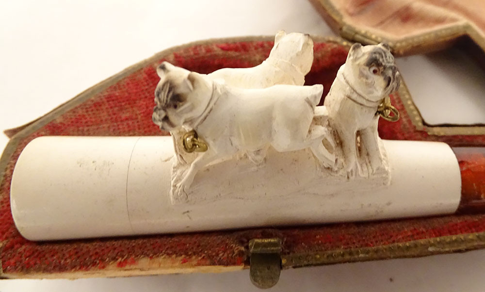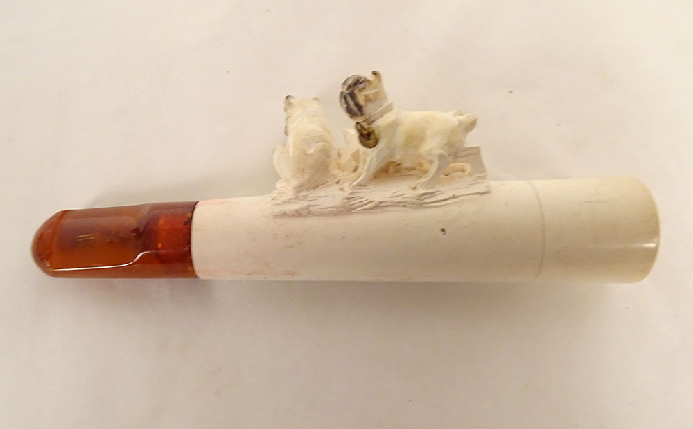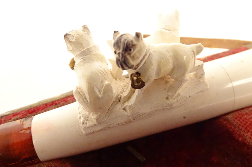 Cigarette holder in amber and sea foam carved with decoration of three small dogs (pugs) with sulphide eyes and metal collars, in its original case with inscription "Echt Meerschaum - Garantirt - Echt Bernstein" (= real sea foam and amber), origin Germany or Austria, vintage 19th century.