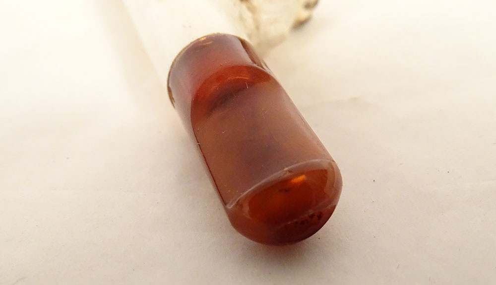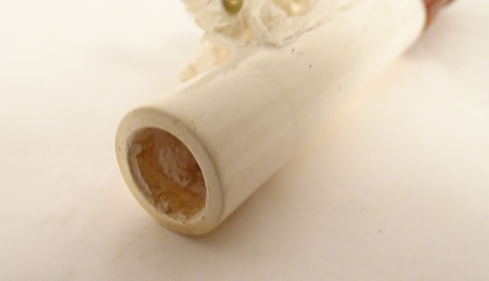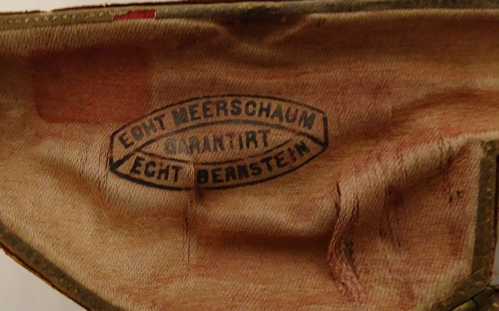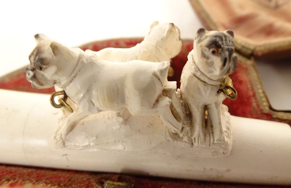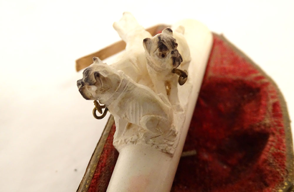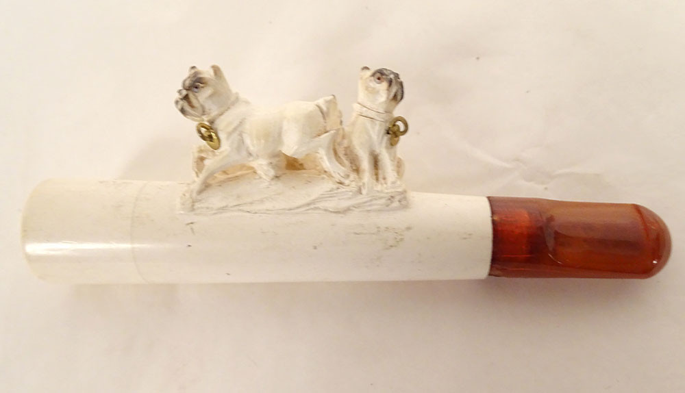 Cigarette holder in amber and sea foam carved with decoration of three small dogs (pugs) with sulphide eyes and metal collars, in its original case with inscription "Echt Meerschaum - Garantirt - Echt Bernstein" (= real sea foam and amber), origin Germany or Austria, vintage 19th century.