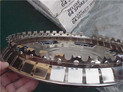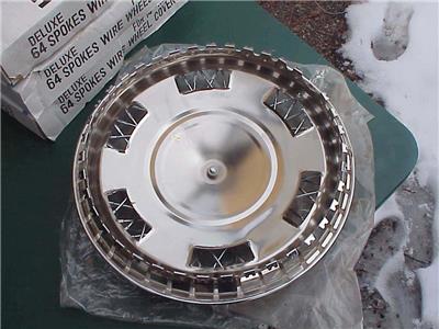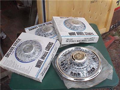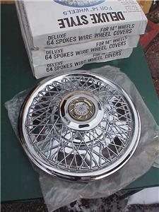 Original very nice set of four 14 inch steel wire wheel covers from the 1960s 1970s never mounted and 3 are still sealed in the boxes. Excellent chrome plating of steel and having 64 wires with attractive center cap. One was removed from box and has just a tiny little scuff on center cap but you really have to look for it. Very minor but I have to mention it. Great chrome on a set made in Taiwan years ago and excellent sturdy quality. No dents or tarnish or corrosion and ready for your car. Will fit old style wheels of fourteen inch diameter.