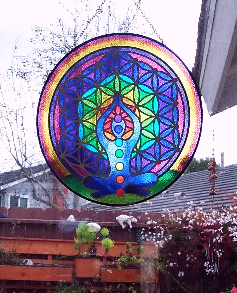 It is a round glass panel with a secure metal rim and a high definition laser generated image of the FLOWER OF LIFE in the center that looks like stained glass. The detail is beautiful and the colors are vibrant. There is enough light going through it to make it almost 3D. I have had one hanging in the sun for over 6 months with no fading. The surface is coated with a UV protective clear coat.