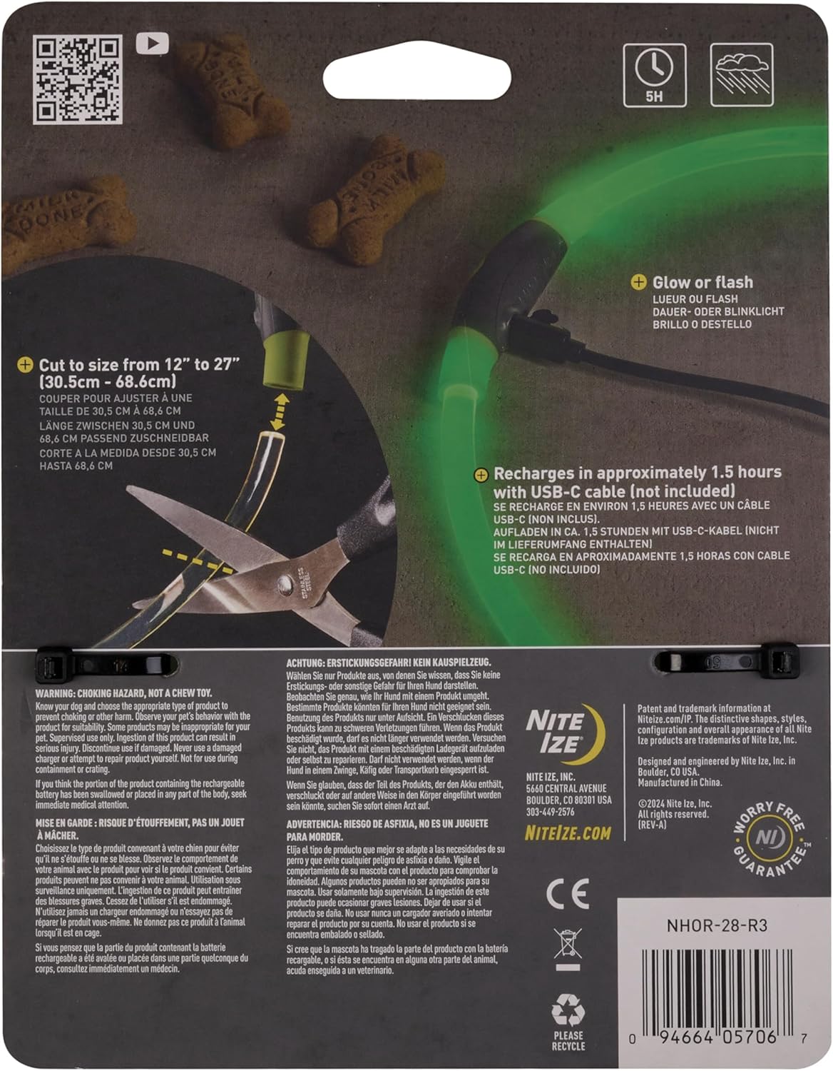 Solve everyday problems with the Nite Ize NiteHowl Rechargeable LED Safety Necklace, designed to keep your furry friend visible during nighttime adventures. This innovative dog necklace features a bright light-up design that ensures your pet stands out in low-light conditions, whether you're strolling through the neighborhood or enjoying an evening in the backyard. Crafted from flexible polymer, the NiteHowl safety necklace offers a comfortable and adjustable fit for dogs of all sizes. The NiteHowl LED dog collar delivers 360-degree illumination with both steady and flash modes, maximizing visibility from every angle. Easily cut the necklace to fit neck sizes from 12” to 27”, ensuring a perfect and secure fit for your dog. The weather-resistant housing is built to withstand various outdoor conditions, making it a reliable choice for your dog-walking accessories. Charging the NiteHowl safety necklace is a breeze with its USB-C compatibility, reaching a full charge in just 1.5 hours and providing up to 5 hours of continuous illumination. Whether you choose the glow or flash mode, this rechargeable dog necklace is an essential tool for keeping your pet safe and visible every night.
