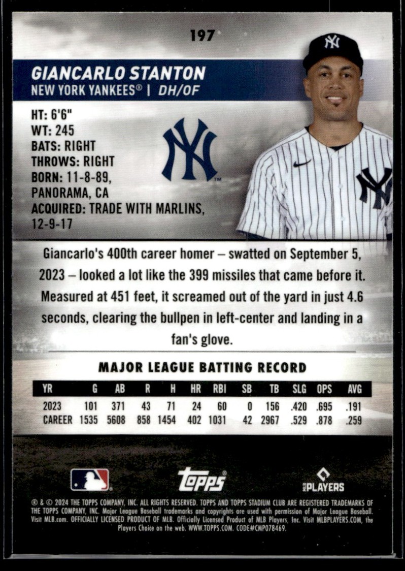 | 2024 Stadium Club Chrome Giancarlo Stanton New York Yankees #197 |