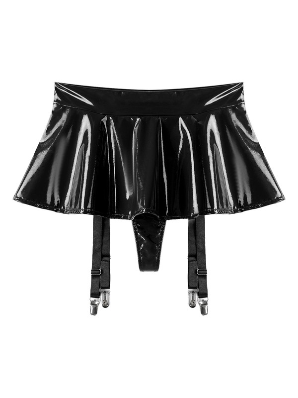 Womens PU Leather Lingerie Set Cut Out Short Sleeve Crop Top with Micro Skirts