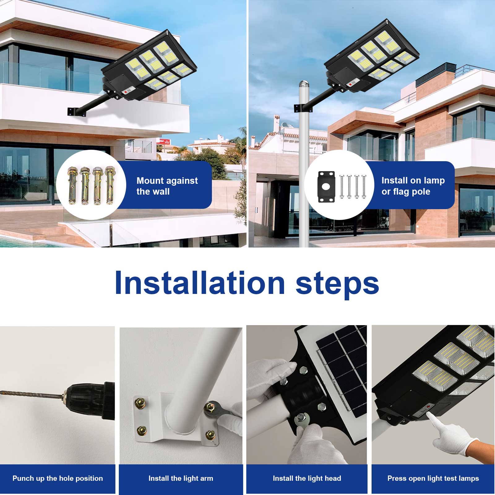 【EASY TO INSTALL AND WIDE APPLICATION】This solar parking lot lights has 2 installation ways, pole mount and wall mount. Very easy and just bolt it on and its ready to go,no wiring is required, which can be easily installed outdoor. Perfect for street and roads, parking lot, basketball court, garage, garden, street, courtyard, yard and squares, etc. Please don’t worry for installation, we have installation video on the product page.