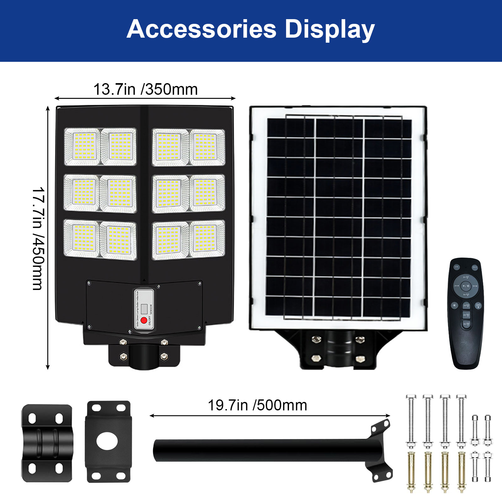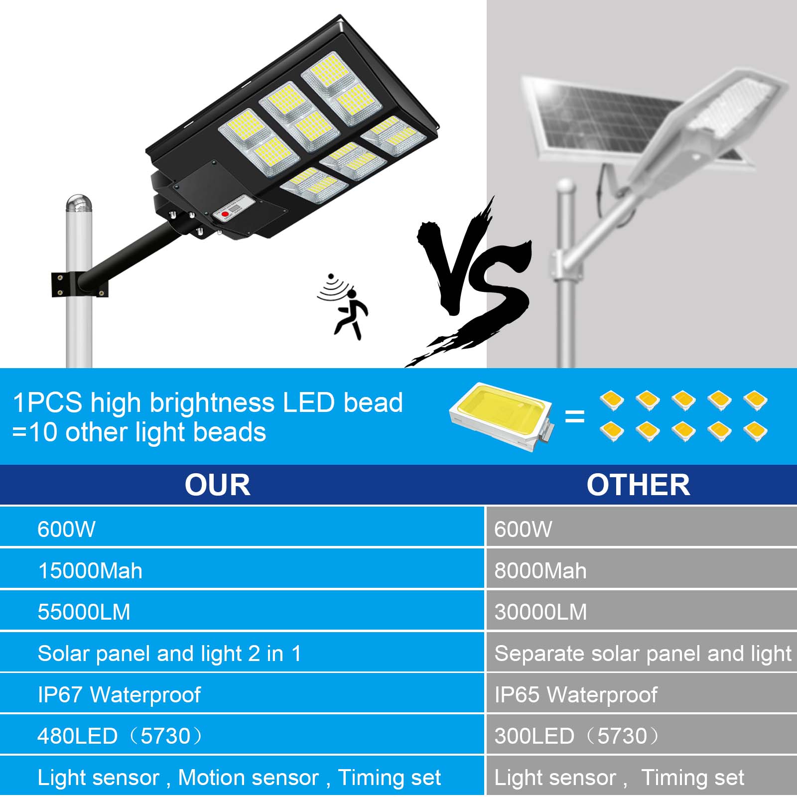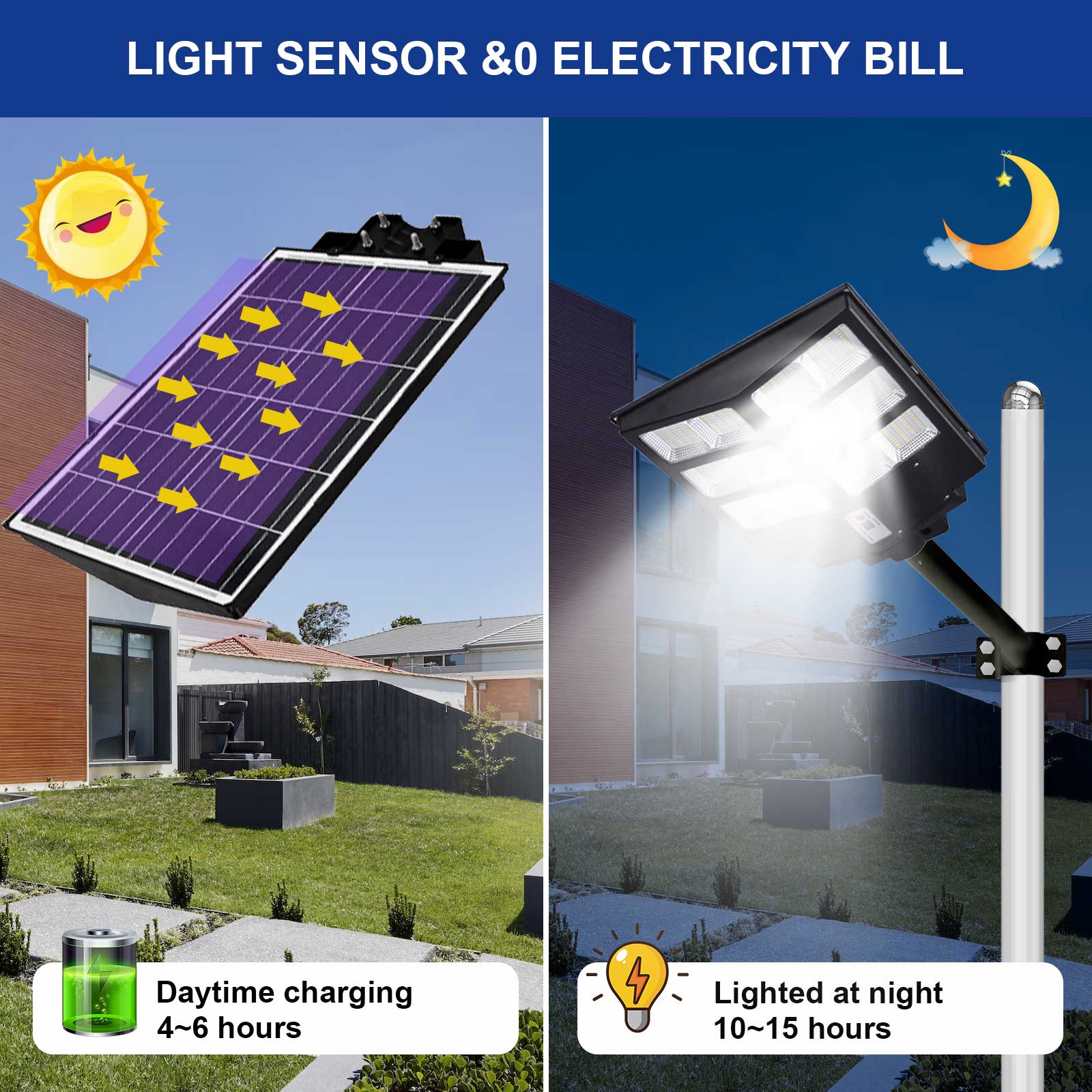 【SUPER BRIGHT SOLAR STREET LIGHTS】This 600W parking lot lights commercial comes with 6500k cool white light, Built-in 480pcs Super Bright LED Beads, it is more bright other led beads, this super bright solar street light provided the clear and bright vision. Before the first use, charge this solar street lamp for 12 hours under direct sunlight.They work from dusk to dawn and still lighting the next day.