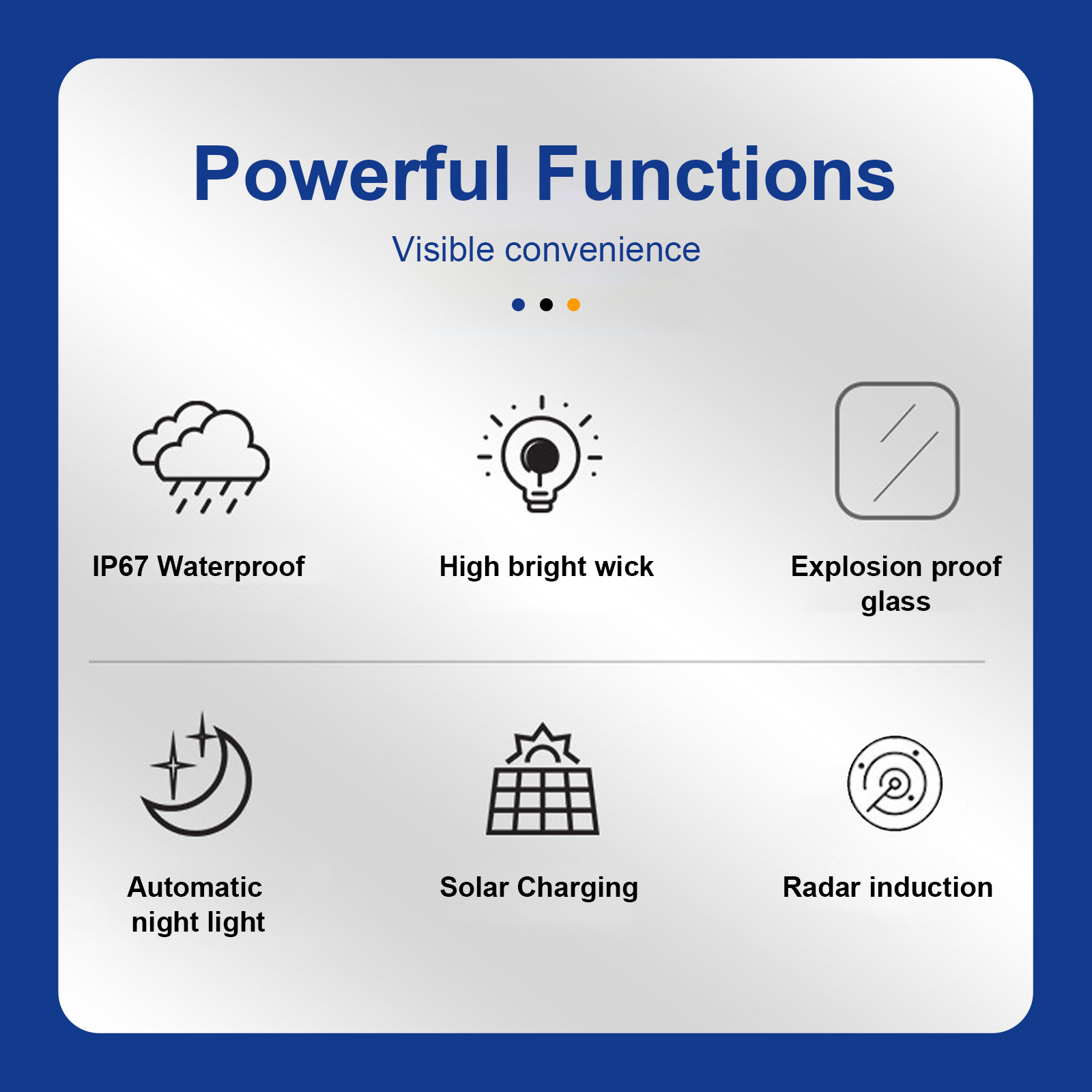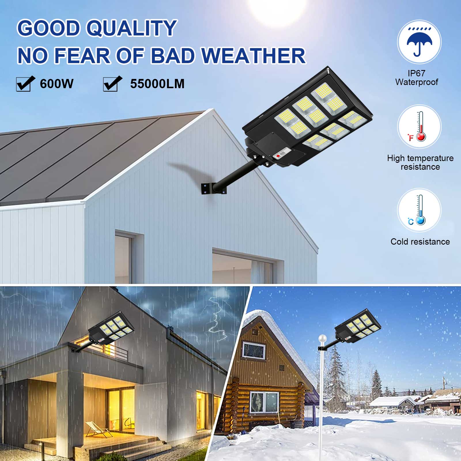 【 DURABLE AND IP67 WATERPROOF 】 The commercial solar street light adopts high-quality ABS and die-cast aluminum material, which is lightning-proof, rain-proof, oxidation-proof and anti-exposure.IP67 waterproof level better than IP66 ip65. IP67 waterproof function makes it work on a rainy day. Its adaptable working temperature is -22℉~140℉.