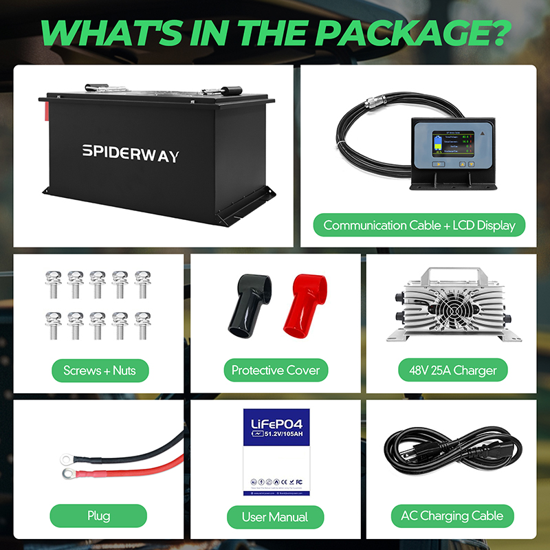 - Get Rid of Lead-acid Now: Spiderway 48V 105Ah lithium golf cart battery unleashes an impressive surge of power, delivering exceptional acceleration and performance. Conquer even the toughest terrains with ease and take your golf game to new heights. Say goodbye to range anxiety! Allowing you to enjoy continuous golfing for up to 50 miles on a single charge.