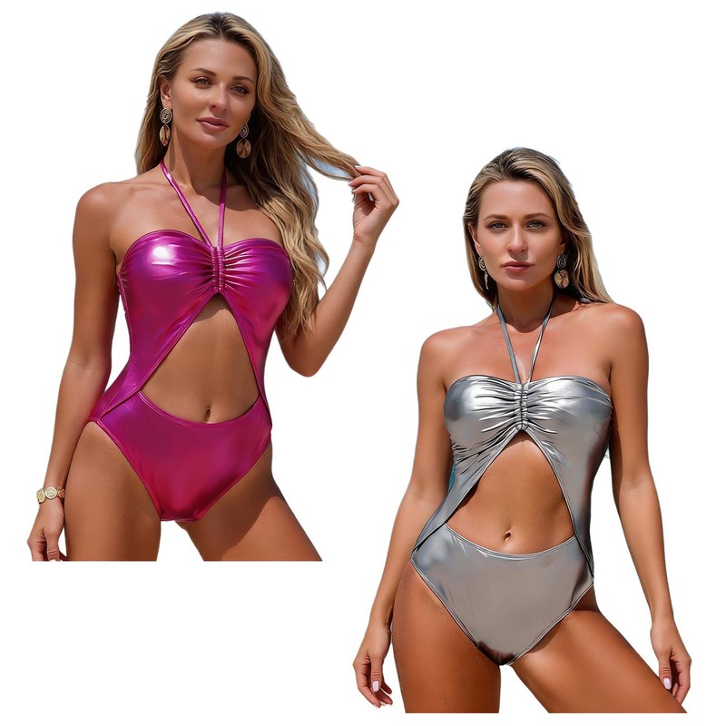 Keyhole cutout in the front, backless and halter neck design, tie closure at back.