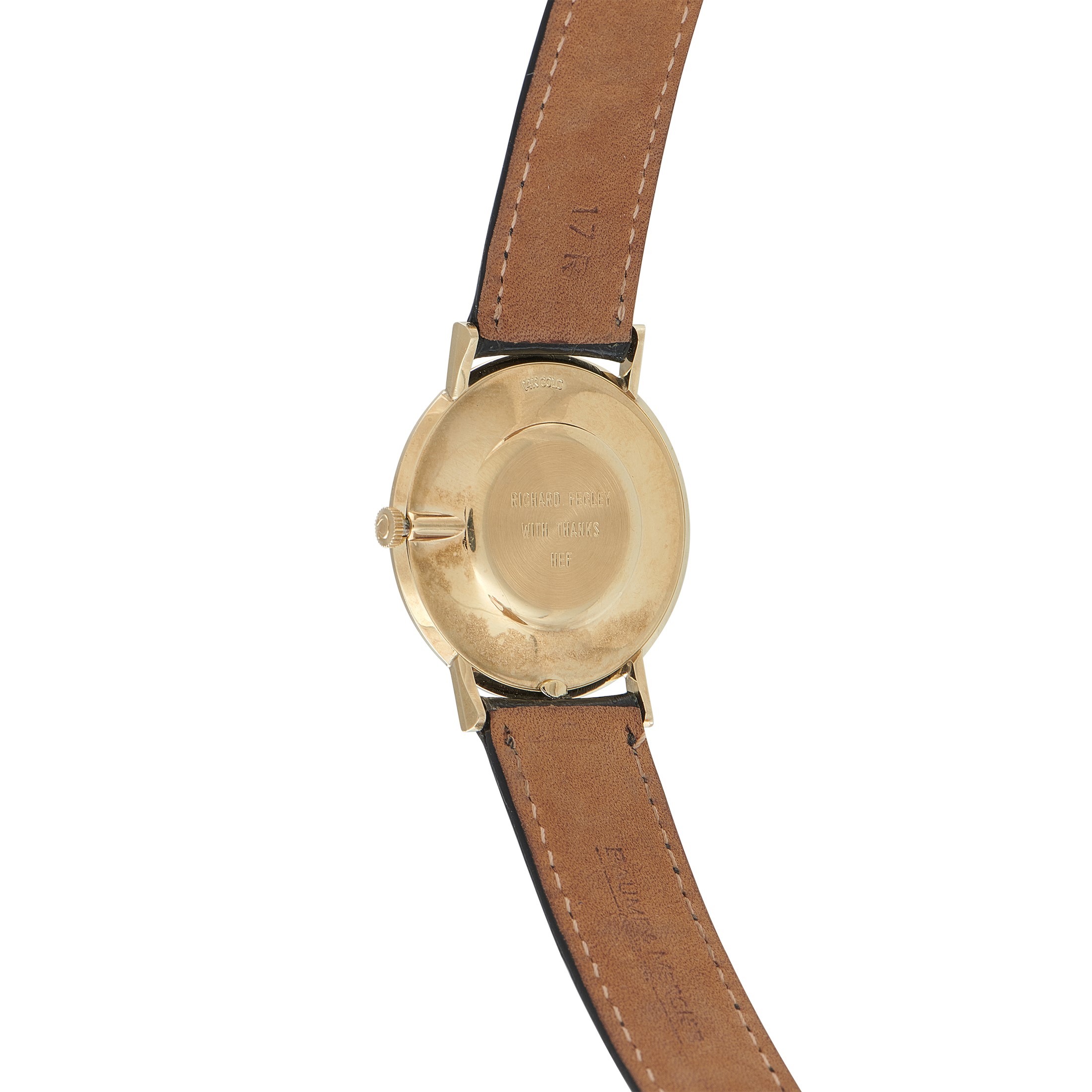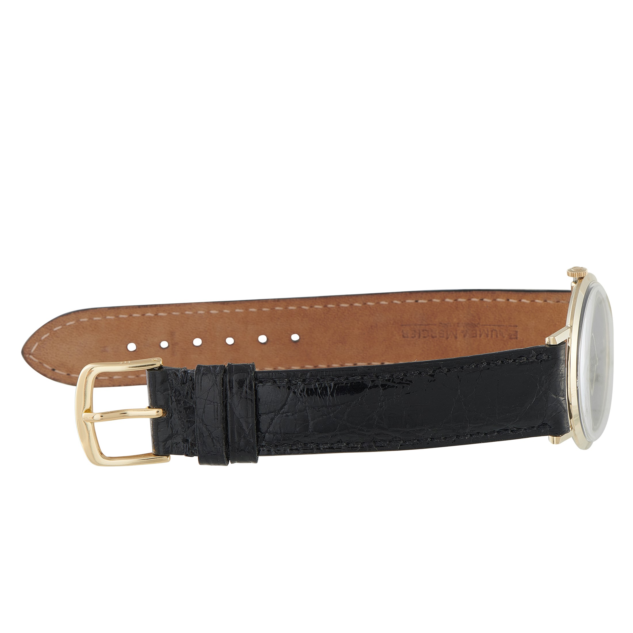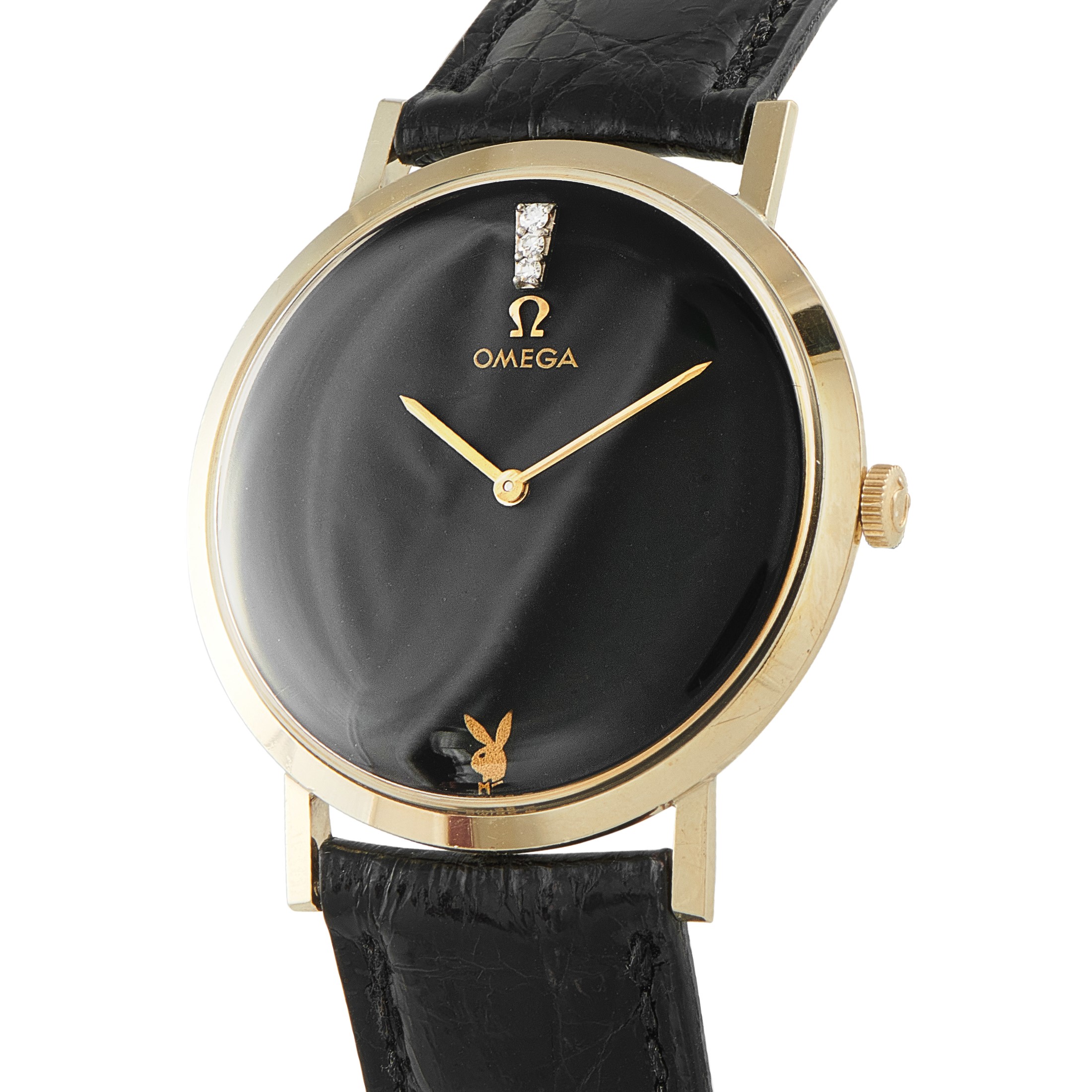 A dress watch with a story tied to a specific place and time. This OMEGA De Ville Playboy was part of a limited gift series associated with Hugh Hefner, presented to select guests and close circles of the Playboy Mansion. The 33mm case is crafted in 14K yellow gold, notably slim, with clean lines suited to evening wear. The minimal dial, time only, has an applied Omega logo, three small diamonds at 12, and the Playboy emblem at 6. Inside is the manual-wind Caliber 625, beating at 21,600 vibrations per hour.This pre-owned Omega De Ville Playboy 14K Yellow Gold Watch D6672 comes with a gift box.