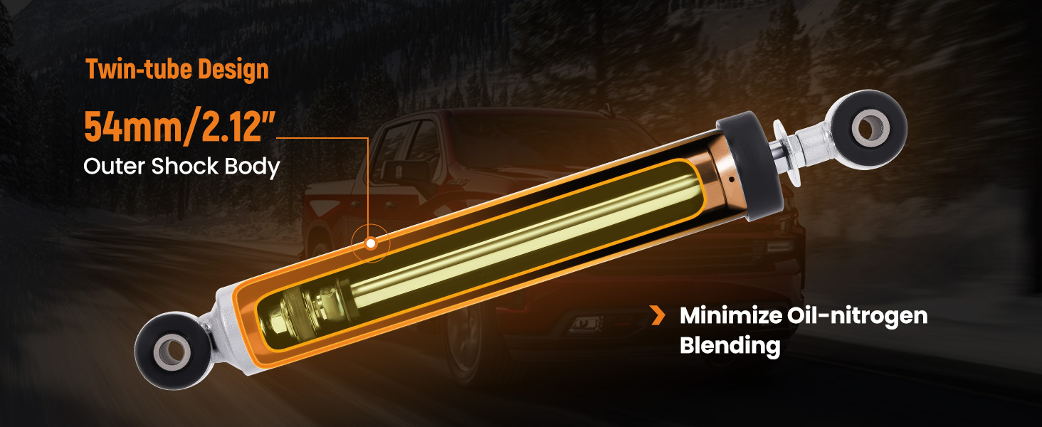 Premium twin-tube shock absorber charged with high-pressure nitrogen, engineered for maximum durability and consistent performance.