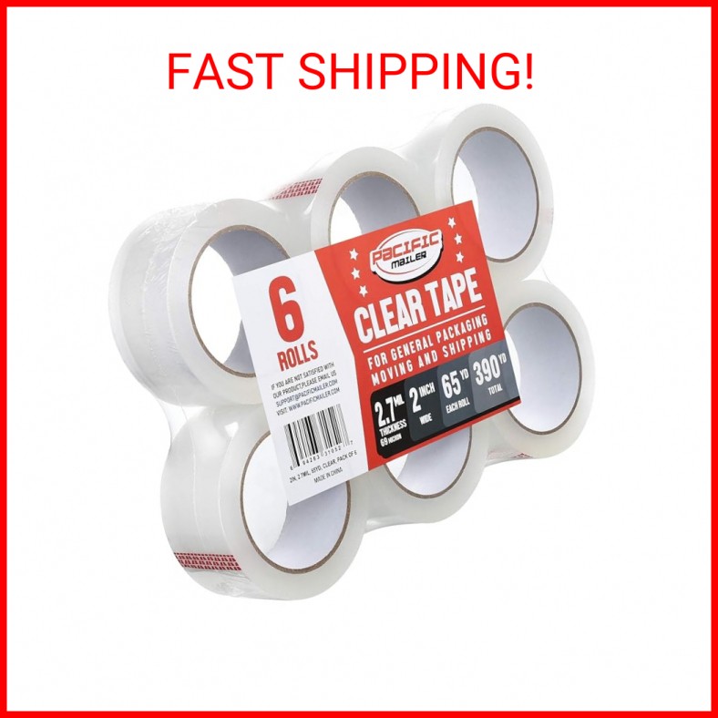 Pacific Mailer Clear Packing Tape, Heavy Duty Packaging Carton Tape for Shipping Packaing Moving Sealing, 2 Inch Wide, 2.7mil Thickness, 65 Yards Per Roll [Pack of 6]
