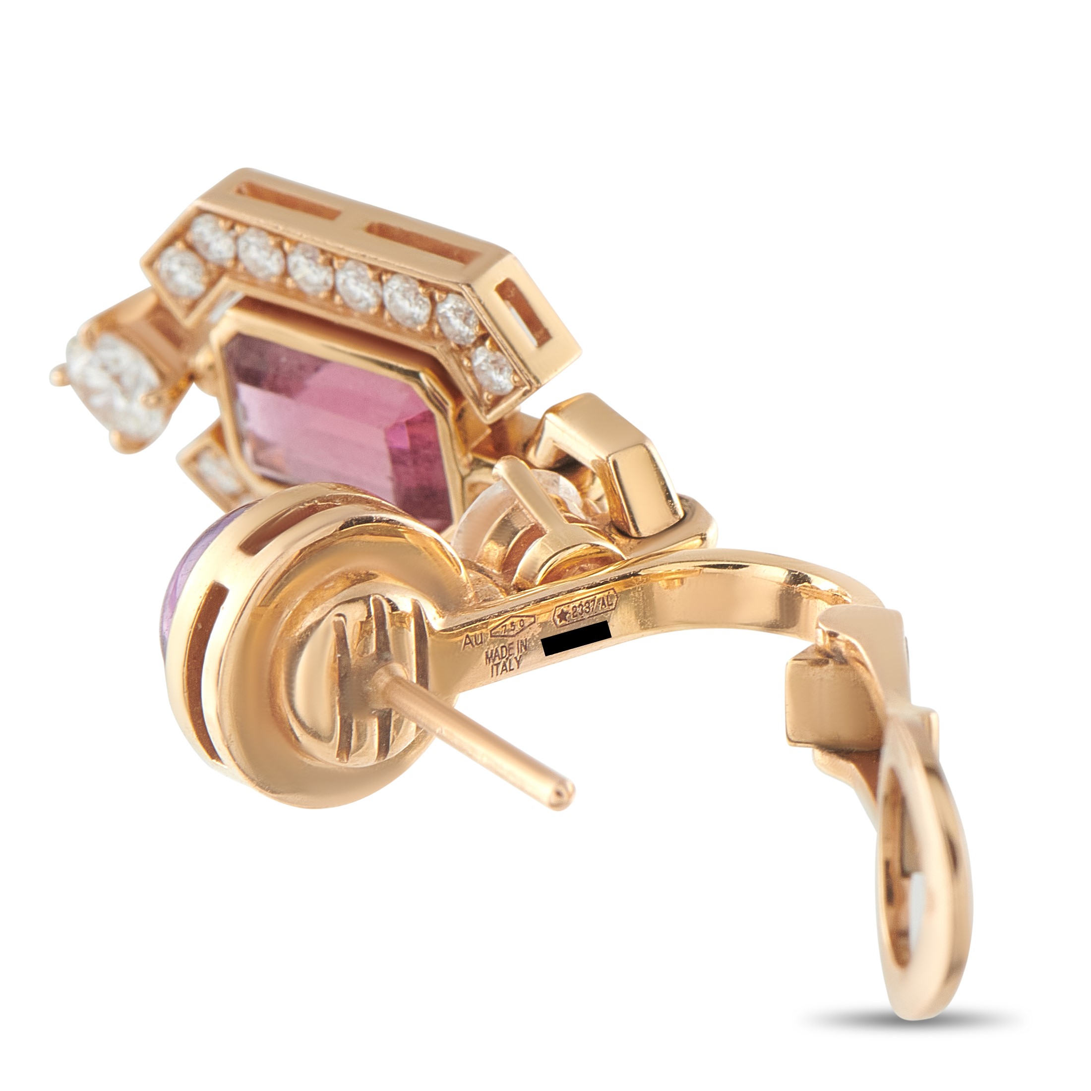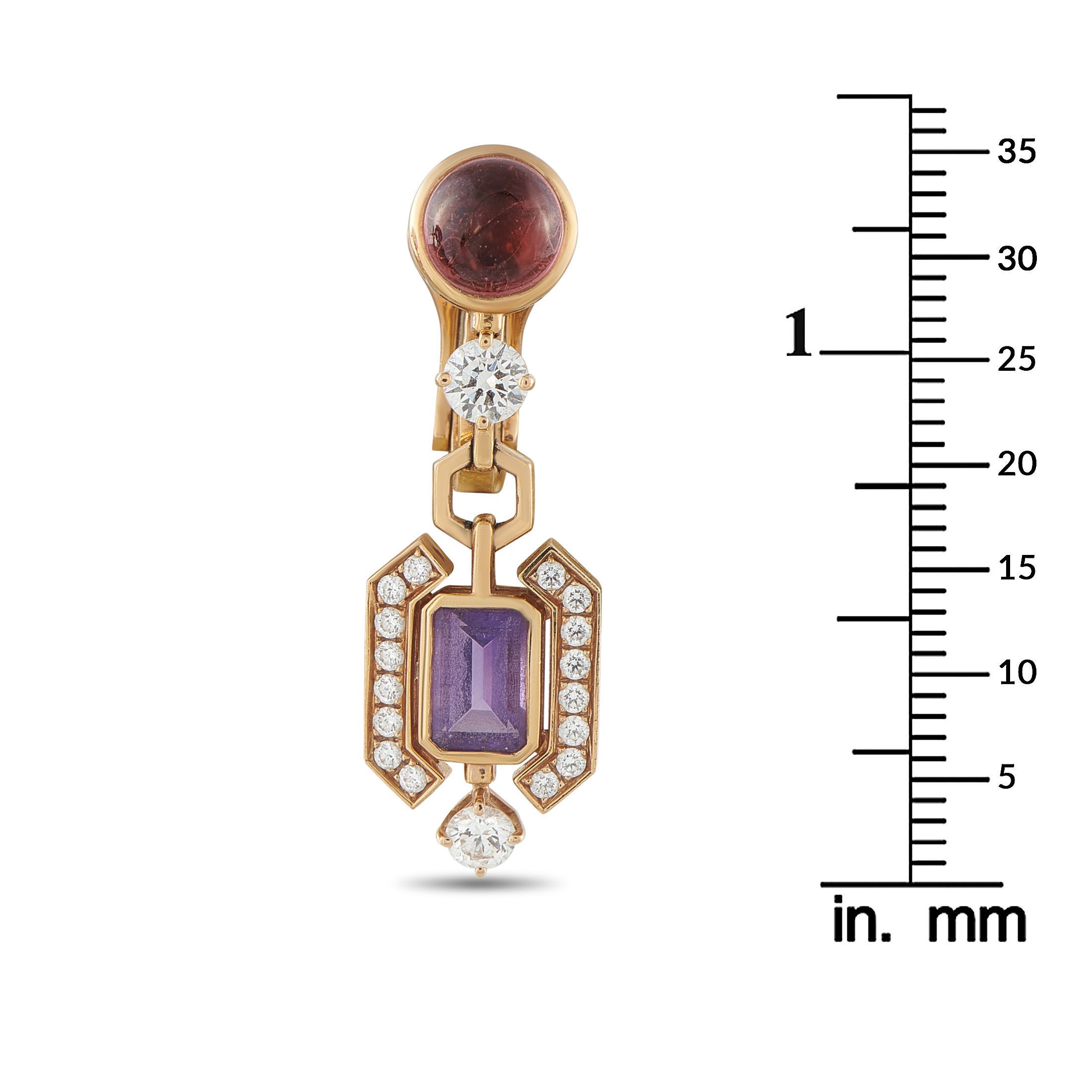 These Bvlgari Allegra earrings are a celebration of color. Amethyst and Tourmaline gemstones complement the warm 18K Rose Gold metalwork. Sparkling Diamonds totaling 1.22 carats provide an additional touch of luxury. Each earring measures 1.38 long by 0.44 wide.This jewelry piece is offered in estate condition and includes a gift box.
