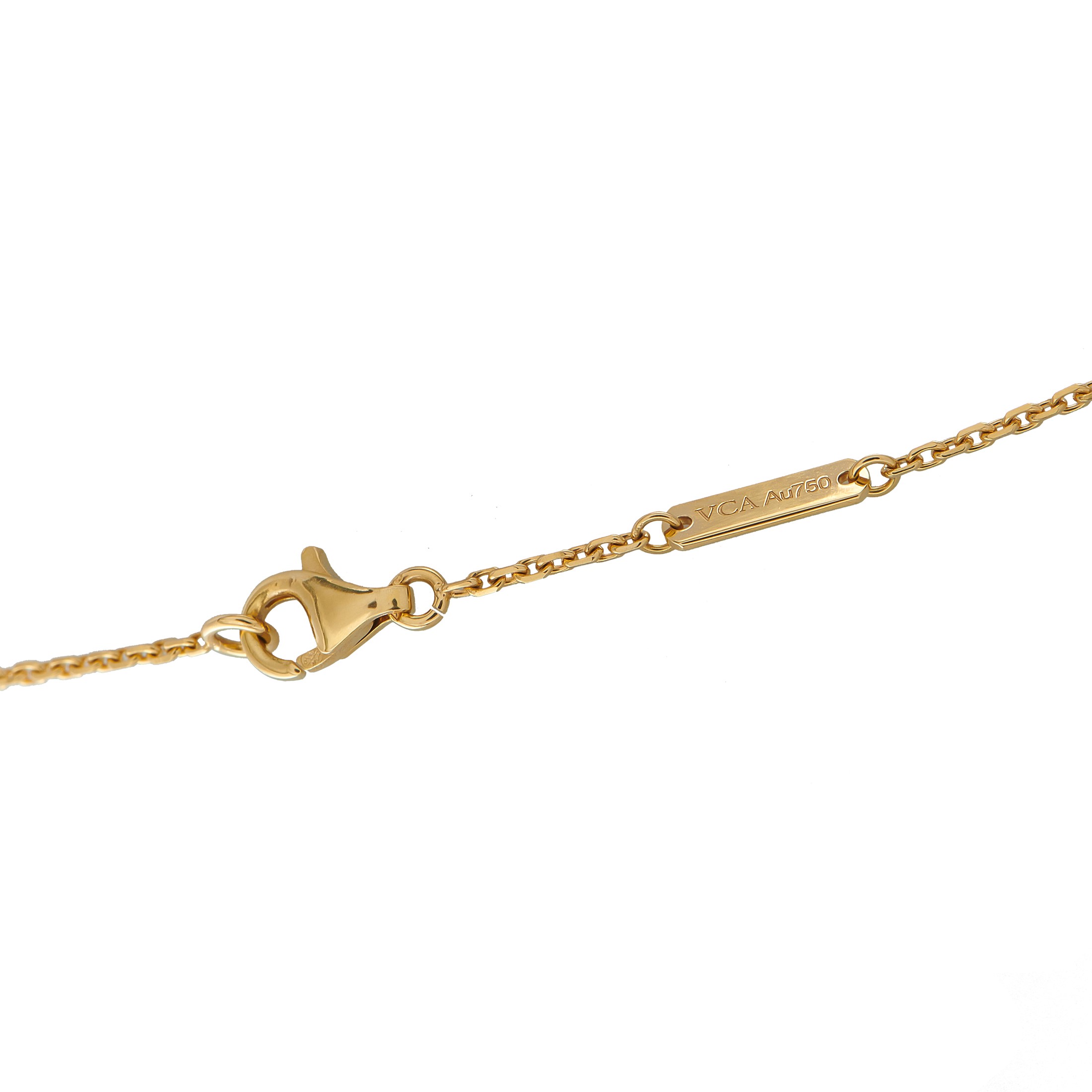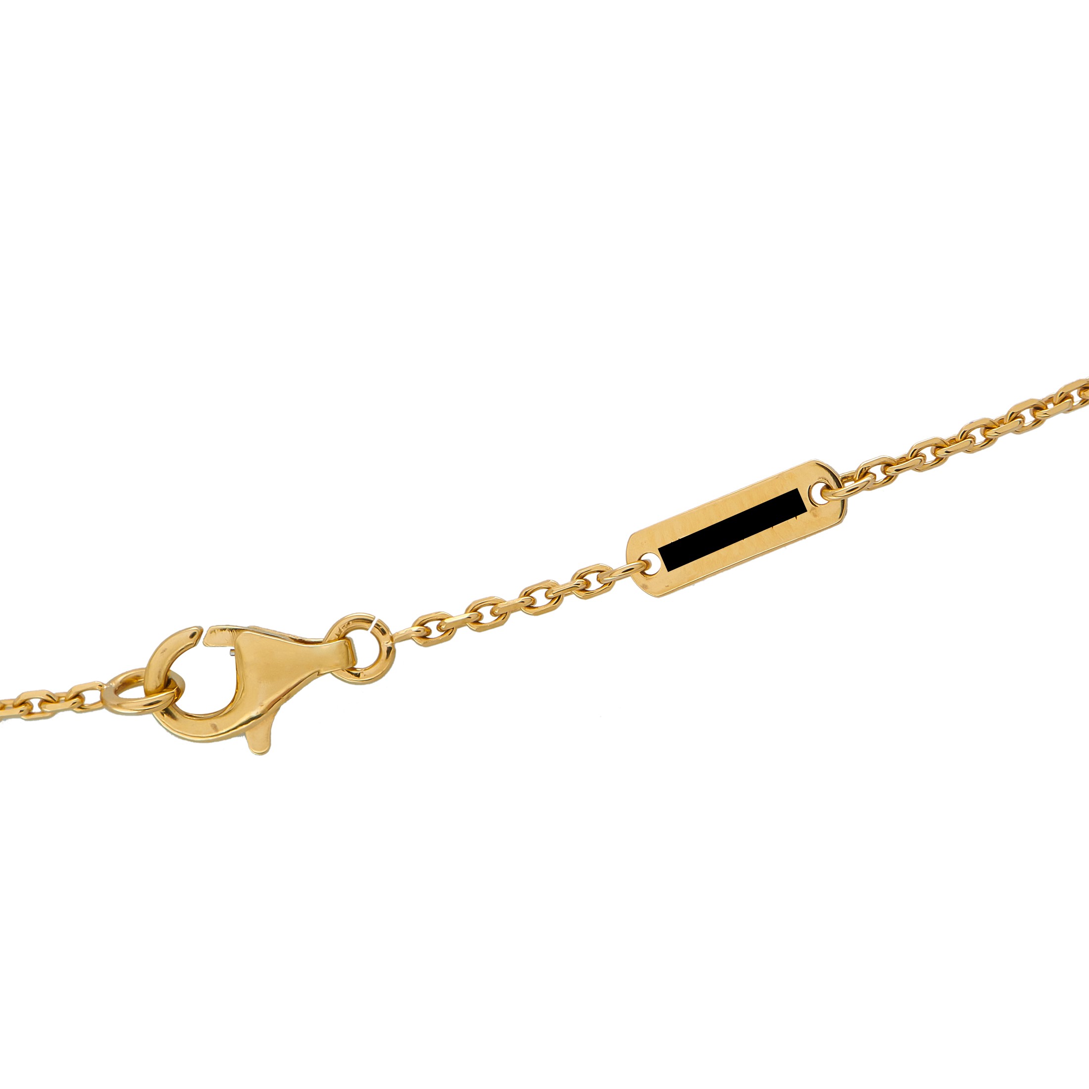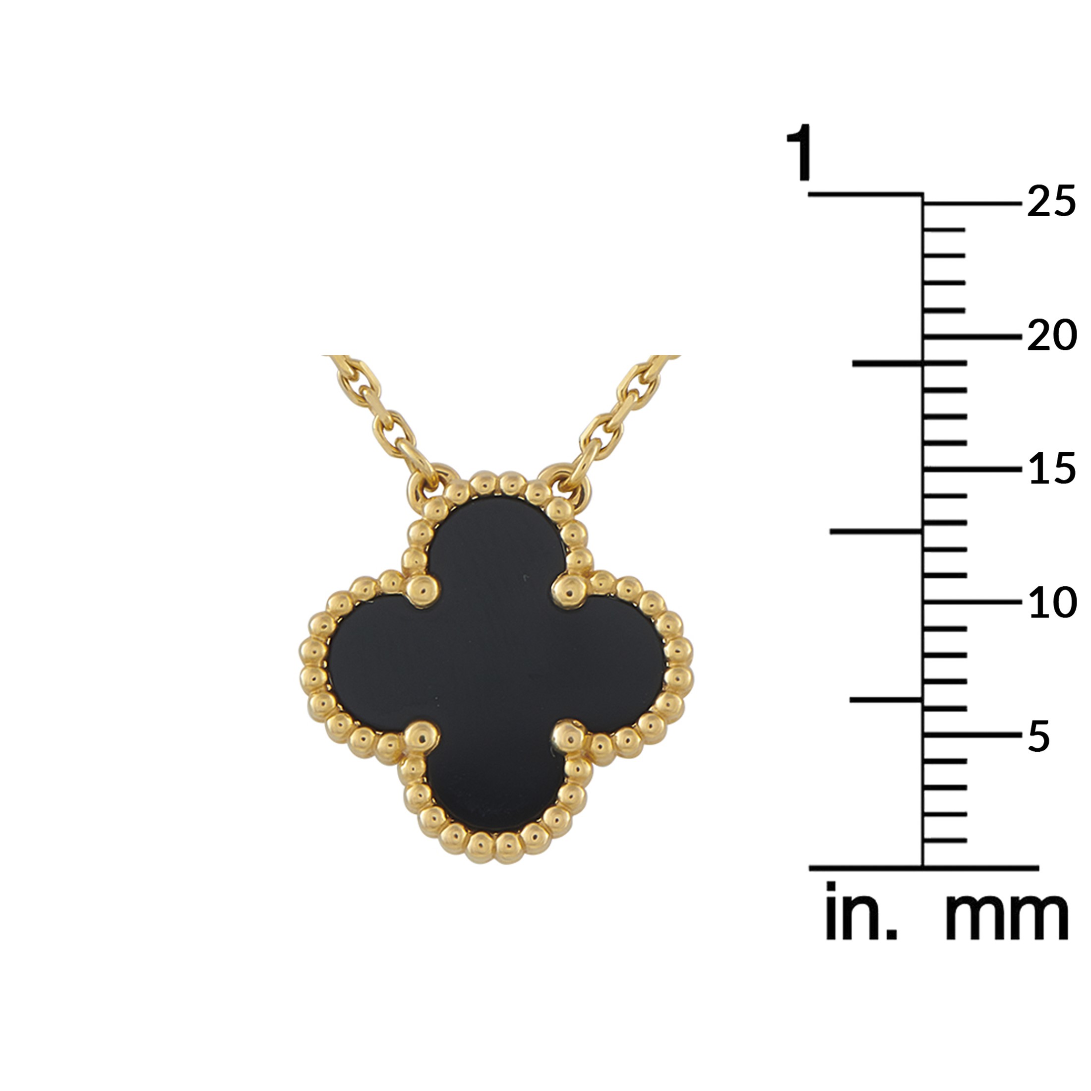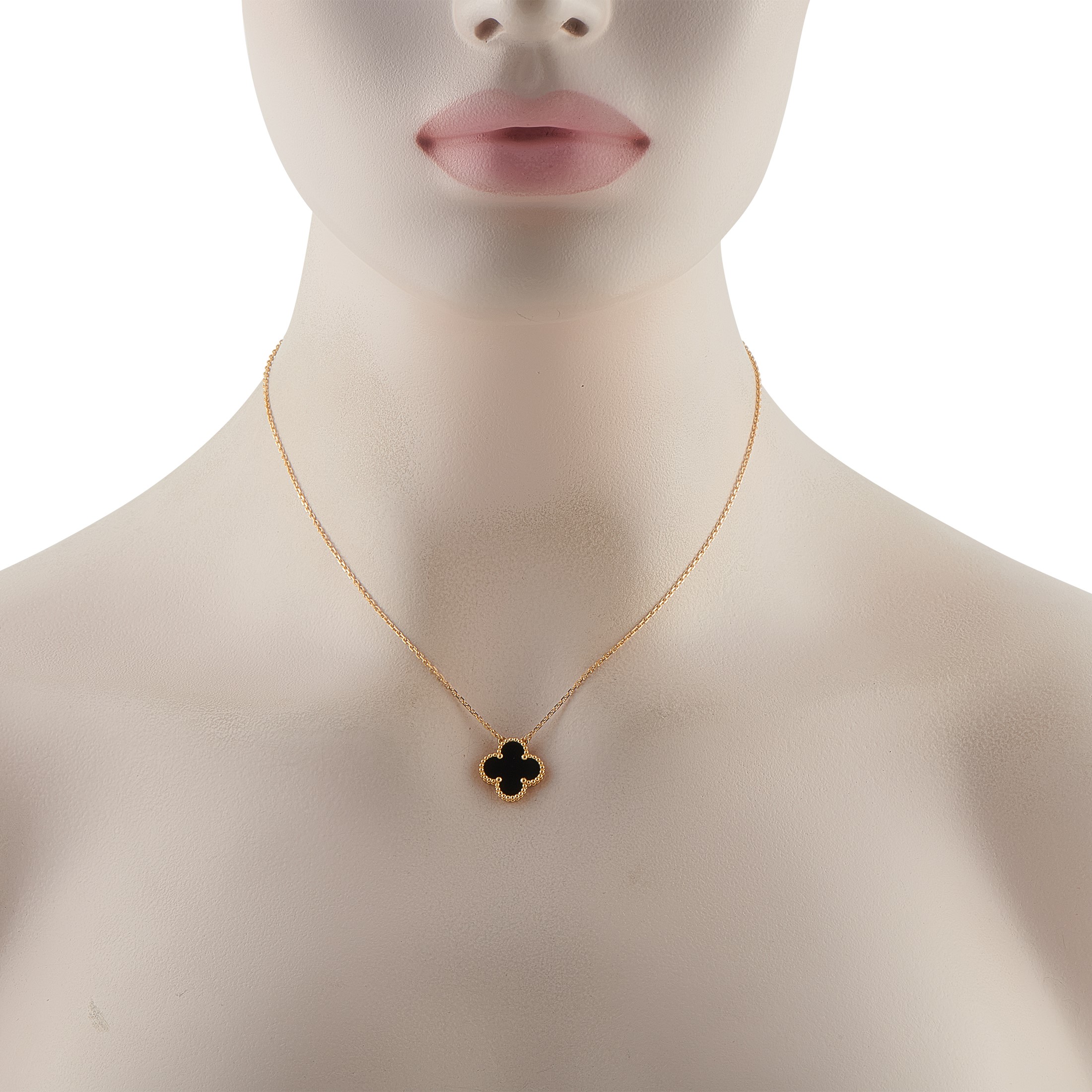 This Van Cleef & Arpels Alhambra necklace will never go out of style. Crafted from 18K Yellow Gold, this instantly recognizable luxury piece features the brands iconic clover-shaped motif in Onyx. The pendant measures 0.57 round and is suspended from a 16 chain.This jewelry piece is offered in estate condition and includes a gift box & papers.