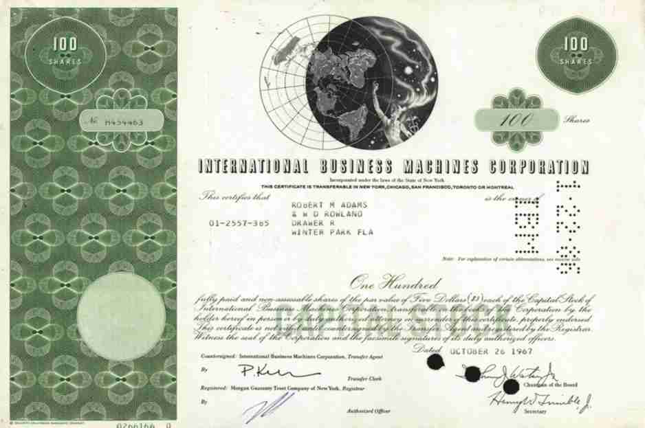 Die RARE GRÜNE IBM Aktie aus 1967 -- Originalaktie -- siehe Bild -- zu 100 Shares der International Business Machines Corporation in Amonk / New York vom 26. Oktober 1967. Produkte und Dienstleistungen im IT-Bereich, sowohl Software als auch Hardware. IBM geht auf die von Herman Hollerith 1896 gegründete Tabulating Machine Company zurück. Seit 1924 jetziger Name. In Deutschland war IBM bis 1949 durch die ertragreiche Tochtergesellschaft DEHOMAG vertreten. 1952 brachte IBM den ersten Computer auf den Markt. Weltweit ist "BIG BLUE" eines der größten Unternehmen zur Herstellung von Datenverarbeitungsanlagen. IBM Deutschland hatte den Sitz bis 2009 in Stuttgart-Vaihingen. Am 12. November 2009 wurde die neue Zentrale in Ehningen offiziell eingeweiht und 2024 das erste IBM-Quantencomputerzentrum außerhalb der USA eröffnet. Weltweit beschäftigt IBM (2023) ca. 280.000 Mitarbeiter, in Deutschland geschätzte 4.500. Sammlerfreundlicher Sonderpreis !