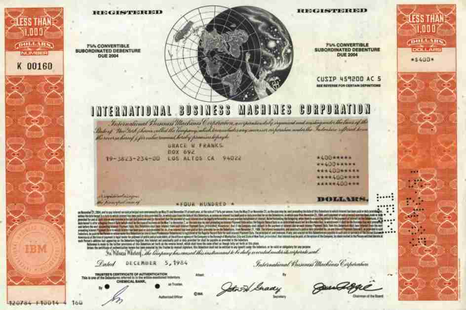 RARER IBM Bond in Orange -- Original - Debenture -- siehe Bild - Einzelstück - über 400 Dollar der International Business Machines Corporation in Amonk / New York vom 5. Dezember 1984. Produkte und Dienstleistungen im IT-Bereich, sowohl Software als auch Hardware. IBM geht auf die von Herman Hollerith 1896 gegründete Tabulating Machine Company zurück. Seit 1924 jetziger Name. In Deutschland war IBM bis 1949 durch die ertragreiche Tochtergesellschaft DEHOMAG vertreten. 1952 brachte IBM den ersten Computer auf den Markt. Weltweit ist "BIG BLUE" eines der größten Unternehmen zur Herstellung von Datenverarbeitungsanlagen. IBM Deutschland hatte den Sitz bis 2009 in Stuttgart-Vaihingen. Am 12. November 2009 wurde die neue Zentrale in Ehningen offiziell eingeweiht und 2024 das erste IBM-Quantencomputerzentrum außerhalb der USA eröffnet. Weltweit beschäftigt IBM (2023) ca. 280.000 Mitarbeiter, in Deutschland geschätzte 4.500. FS Unterschriften vom bekannten Chairman. Sammlerfreundlicher Sonderpreis !