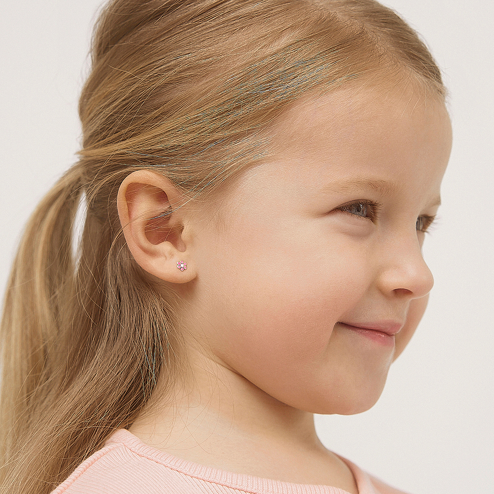 Your little girl will look precious with these adorable baby earrings made of 14k gold which are suitable for sensitive ears. Featuring a cute daisy flower colored with pink and white enamel, leading to a post with safety screw backs for children. These gold flower earrings make a perfect gift for any special occasion such as holidays or birthdays. A complimentary gift box is included for your convenience.