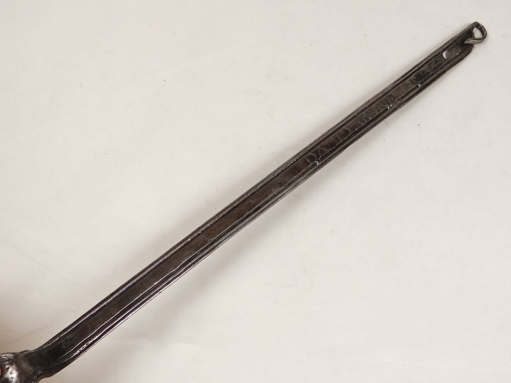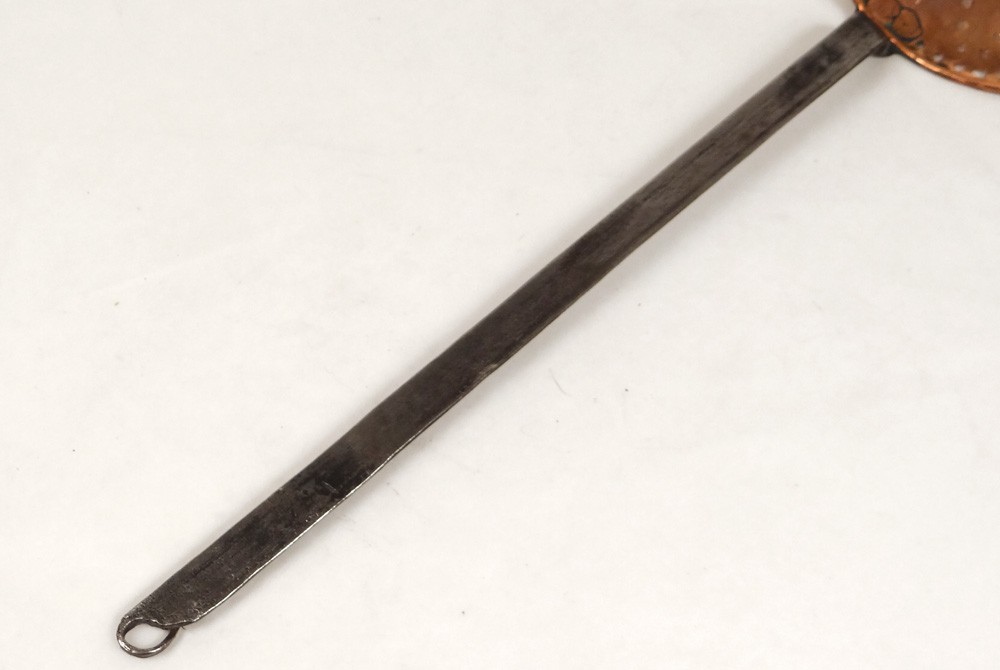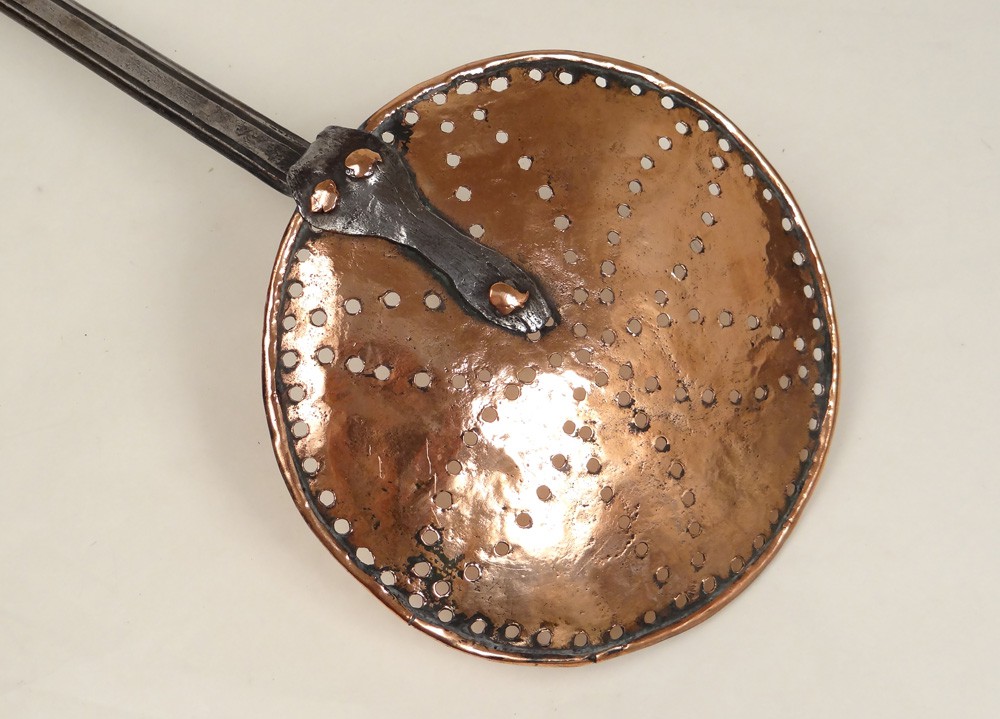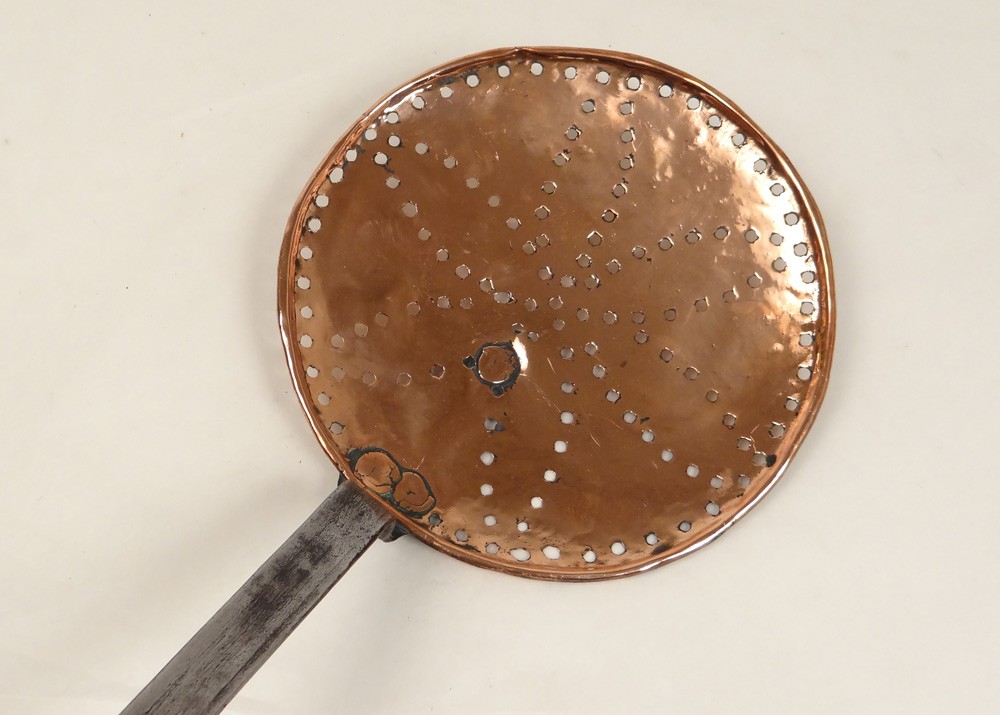 Bellissima schiumarola in rame e ferro battuto, firmata David Jones, vintage fine XVIII-inizi XIX secolo.