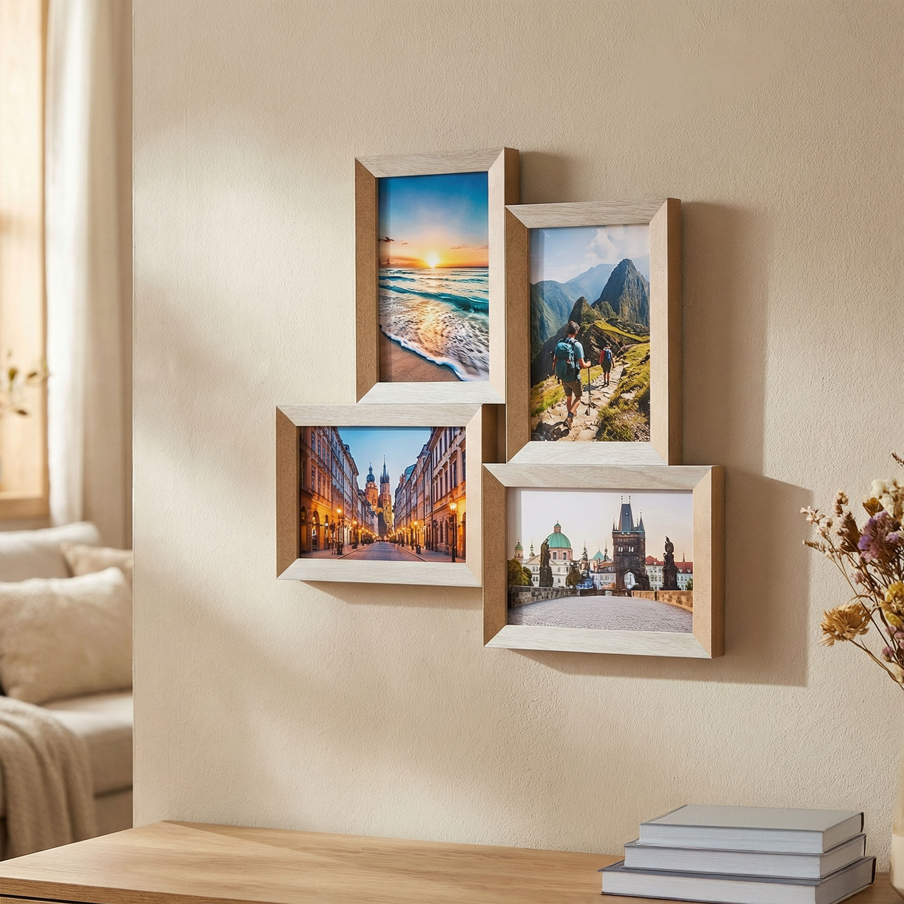 mit natürlicher Holzmaserung fügt sich das Design nahtlos in zeitgemäße Einrichtungsstile ein. Vier Lieblingsmotive finden in diesem Bilderrahmen aus