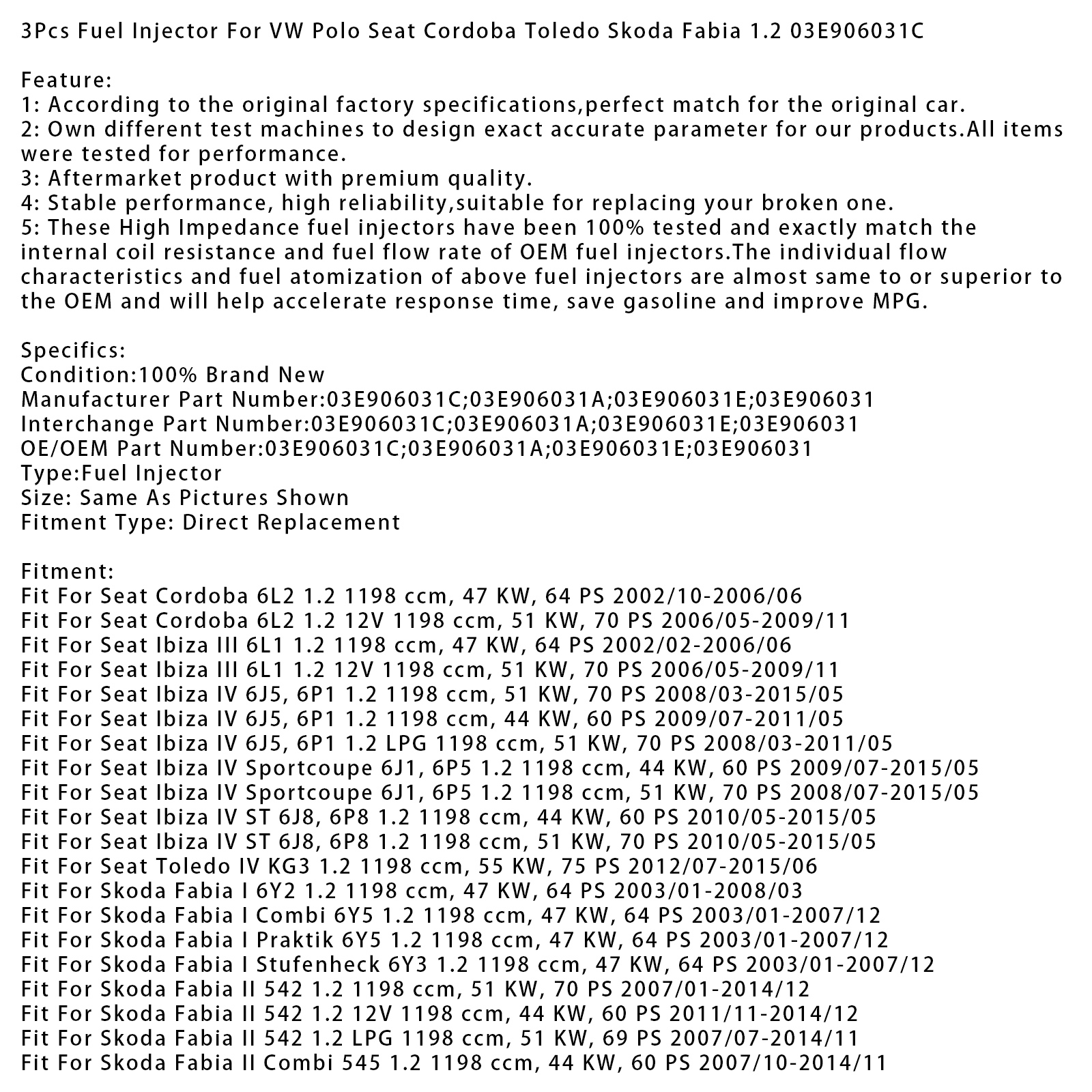 3Pcs Fuel Injector For VW Polo Seat Cordoba Toledo Skoda Fabia 1.2 03E906031C