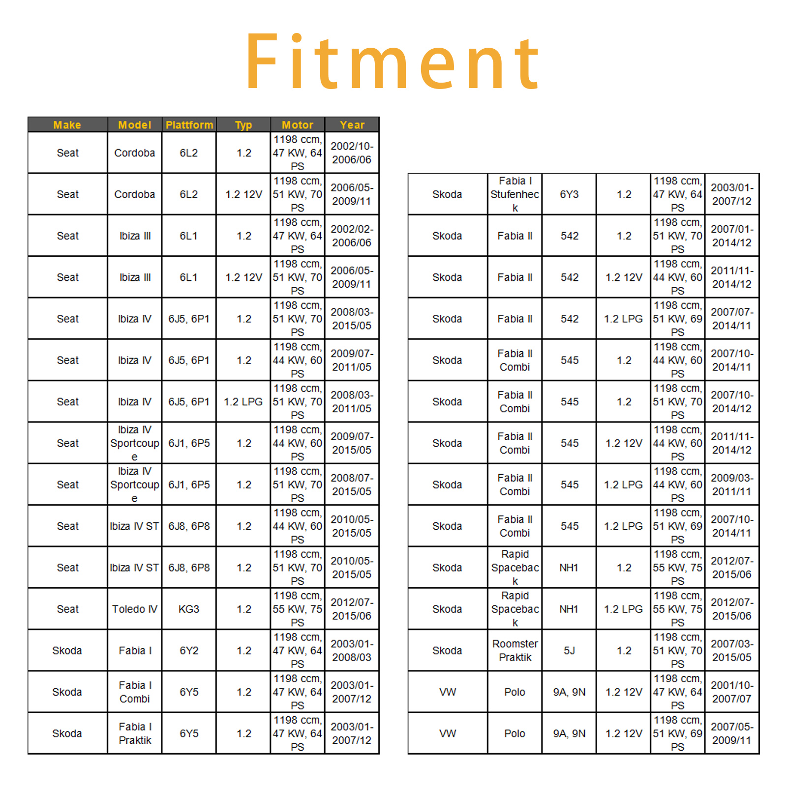 Fit For Skoda Fabia II 542 1.2 12V 1198 ccm, 44 KW, 60 PS 2011/11-2014/12