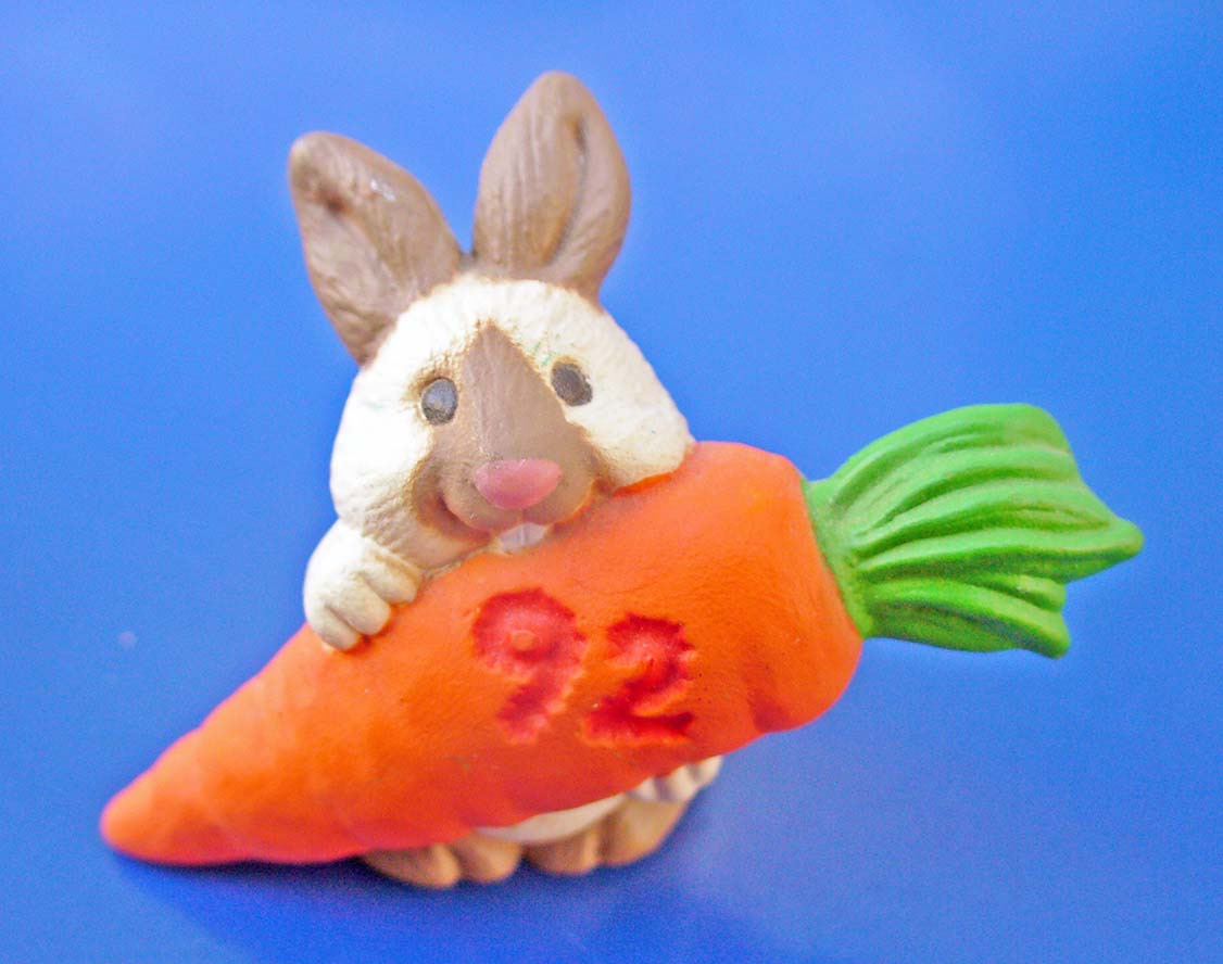 Description: This vintage Hallmark Merry Miniatures Easter figurine features the cutest little brown and white bunny rabbit holding a large carrot incised with the year "92" in dark pink numbers.Condition: NEW OLD STOCK, UNUSED, MINT WITH THE ORIGINAL GOLD FOIL STICKER