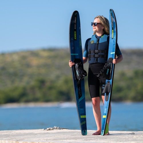 The Jobe Mode Combo Waterskis are high-end skis that are perfect for serious combo skiing and enable you to transition into free ride slalom skiing. They feature direct mount bindings, a v-bottom and extra bright aluminium fins.