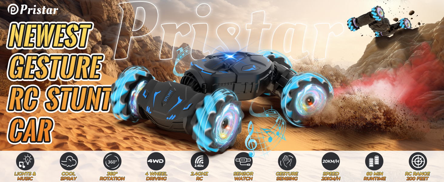 - Superior Gaming Experience: Pristar gesture sensing car has cool color-changing lights, realistic sound effects of sports cars starting, accelerating, drifting, and deforming, extremely exciting sprays, and cheerful music in automatic driving mode. Amaze boys and girls with various thrilling stunts and immersive driving experience. Day or night, indoors and outdoors, this RC car is more fun.