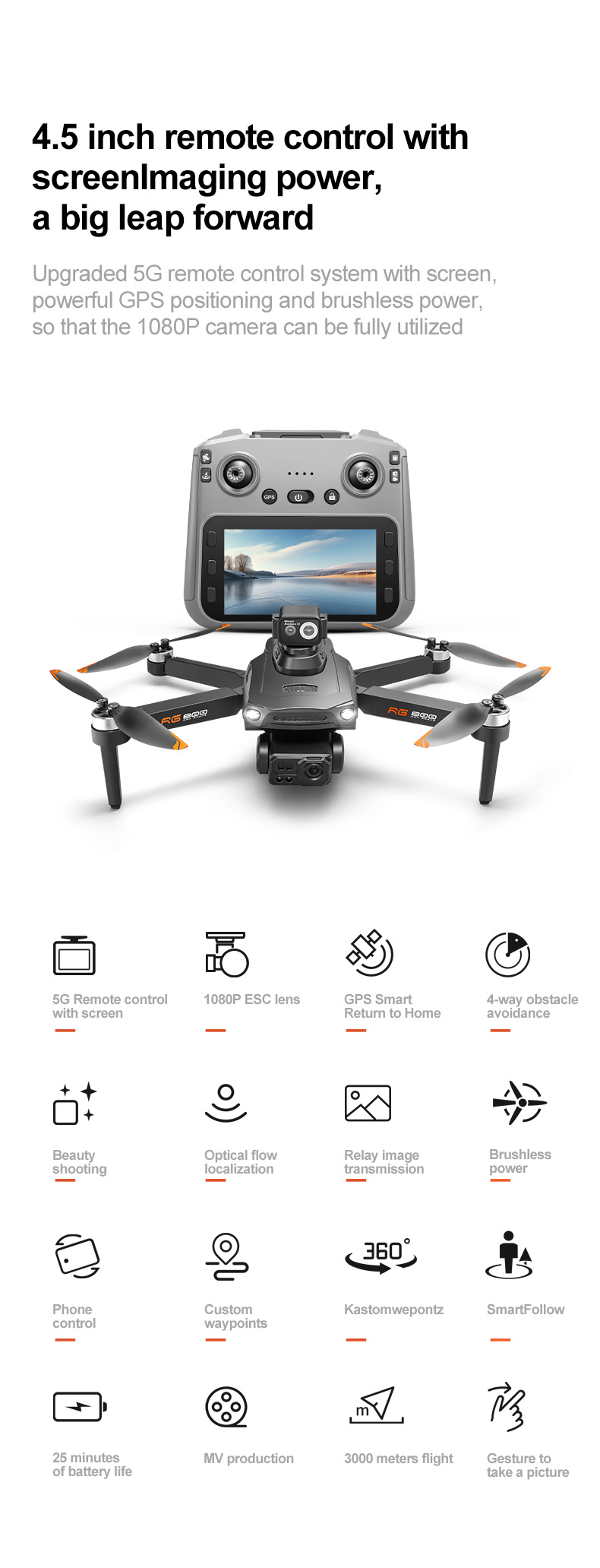 5, lens adjustment 90°, intelligent follow, surround flight, palm control, map real-time positioning drone, out-of-control map planning route, APP mobile phone control, one-button return, headless mode, rise and fall, forward and backward, left and right side flying, can switch optical flow /GPS, gesture photography, optical flow positioning, brushless motor, ultra-long endurance, 360° laser obstacle avoidance