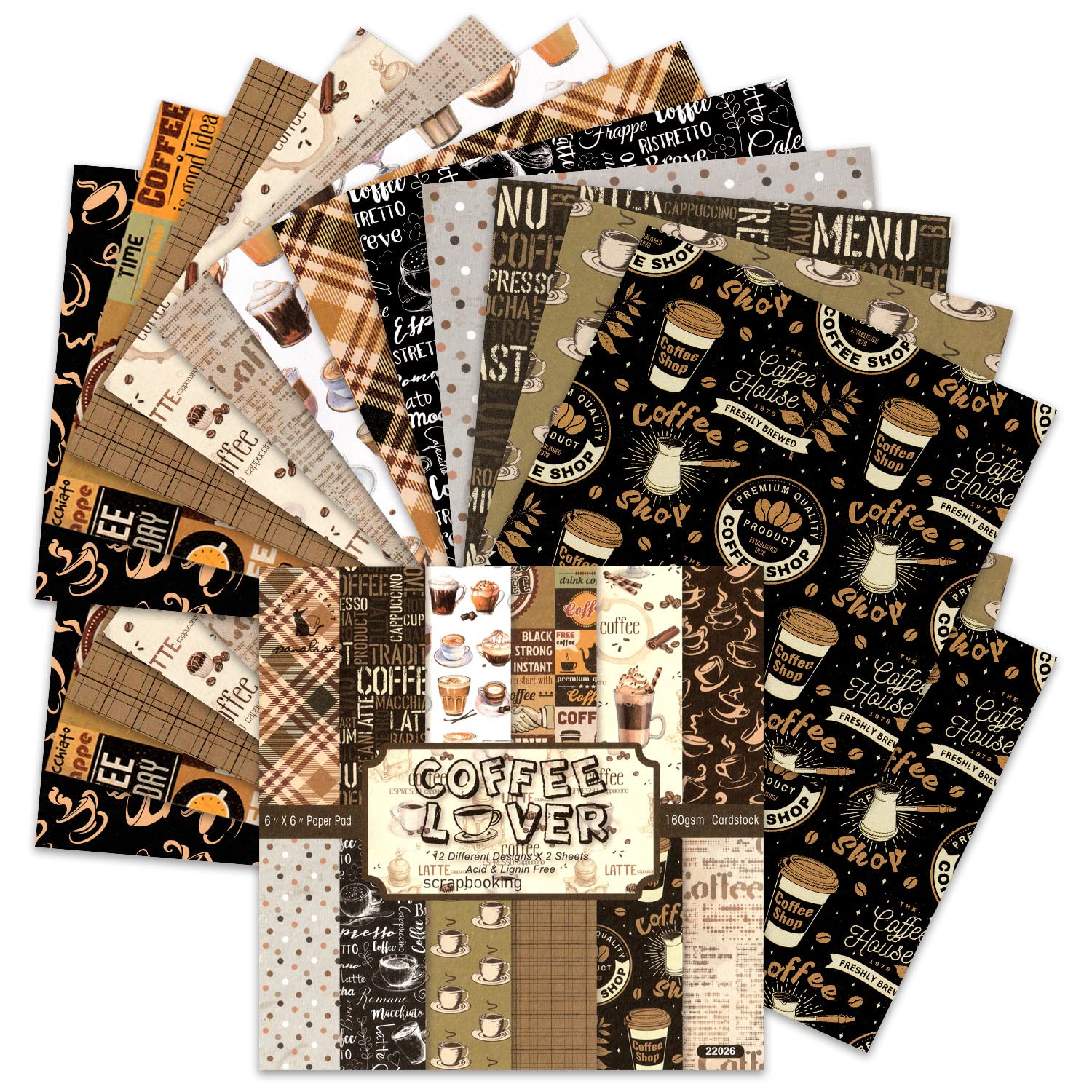 【12 Designs 24 Sheets】- Decorative paper includes 12 different coffee lover paper pattern designs, 2 sheets of each, a total of 24 sheets of scrapbooking paper with 6x6 inch size. Ideal for paper craft lovers.