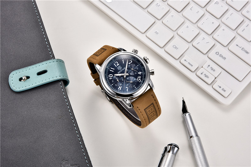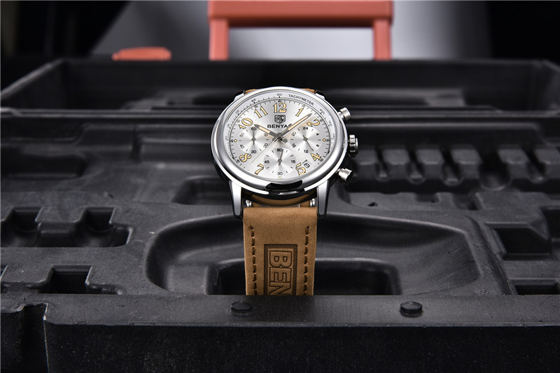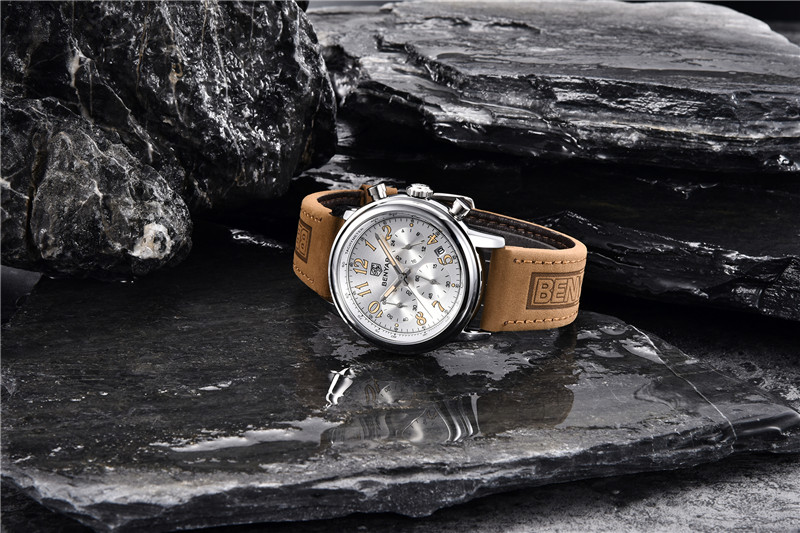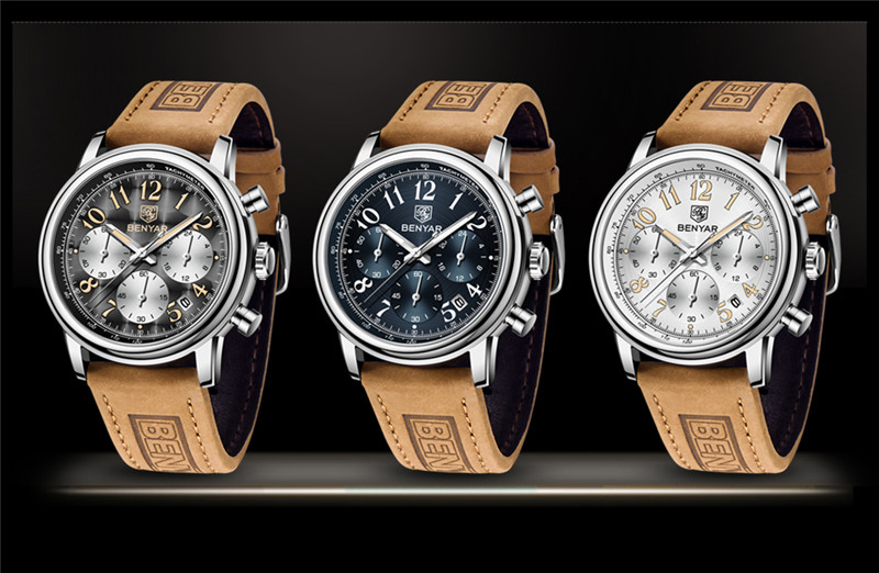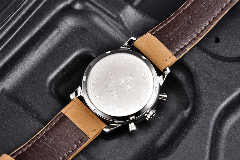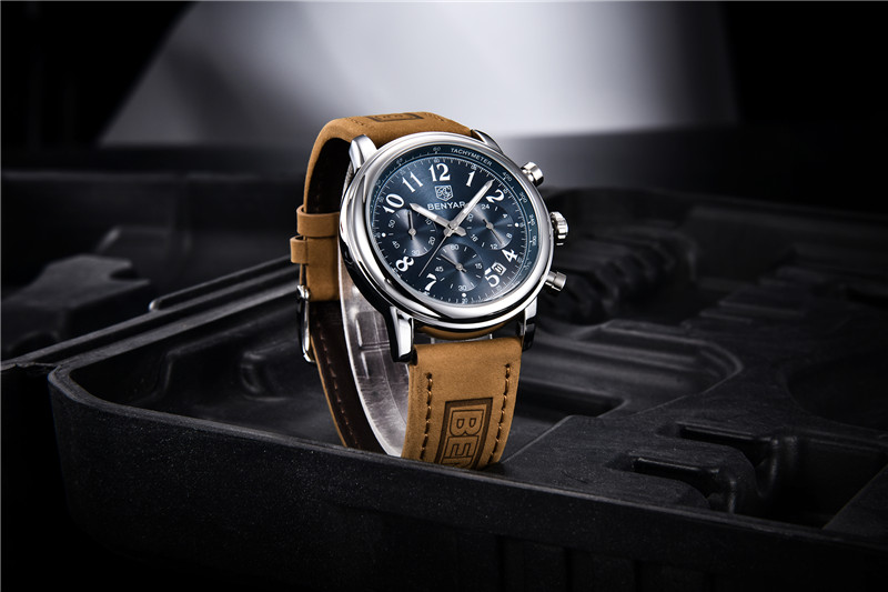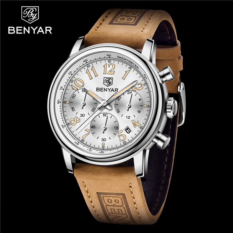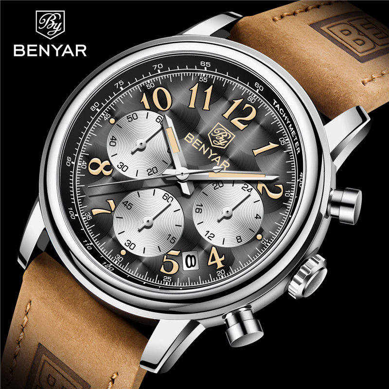 Benyar Men's Analog Chronograph Quartz Watch Leather Waterproof Wristwatch Gifts