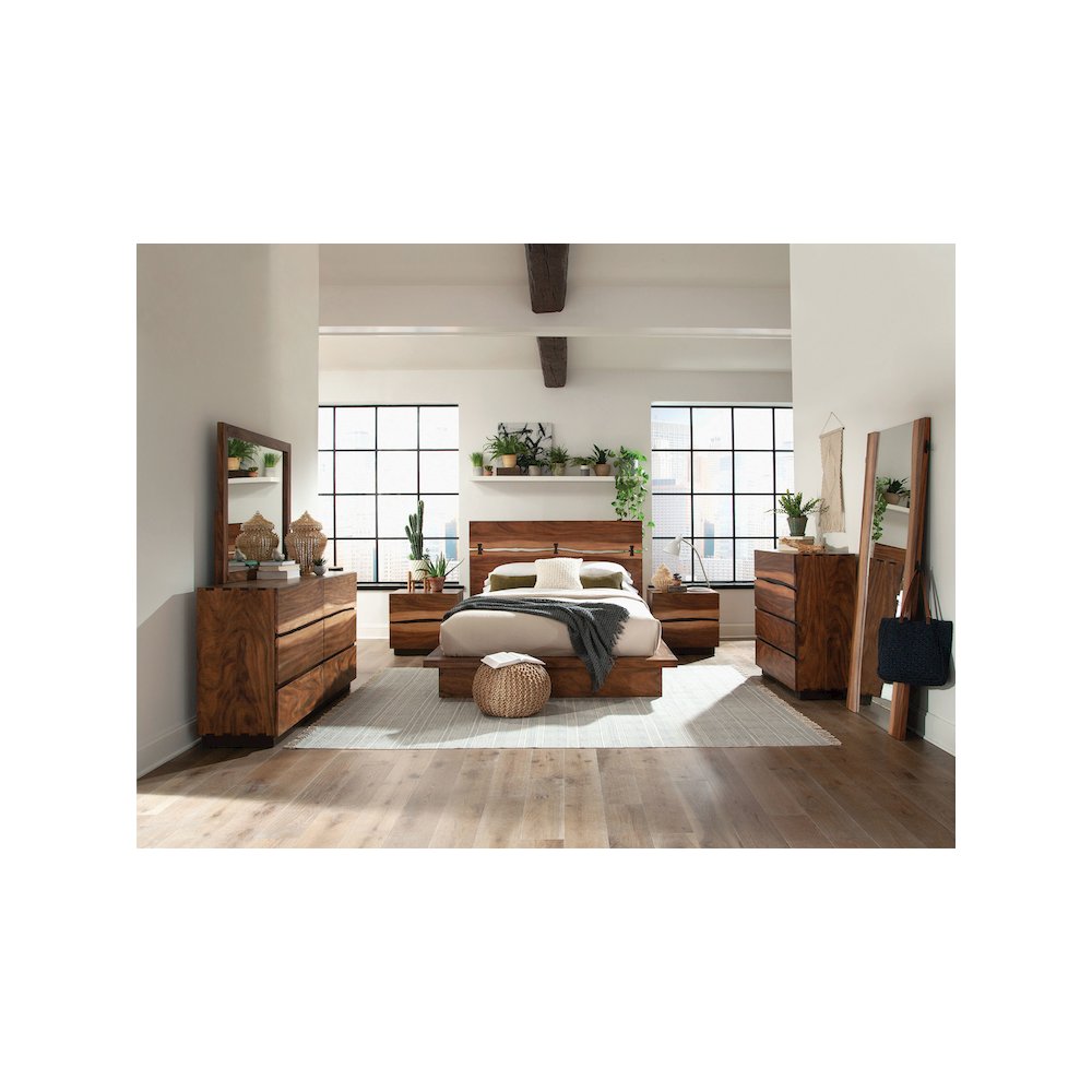 This expertly fashioned five-piece bedroom set offers durability and style suited for any master bedroom. Each piece comes with a smokey walnut finish with contrasting wood grain accents that is both modern and timeless. The eastern king bed has a platform design for the mattress and a two-piece headboard with a stylishly full-length opening. The nightstand, chest, and dresser have deep, spacious drawers to handle all your storage needs. A dresser mirror completes the collection for a set that's everything a master bedroom needs.