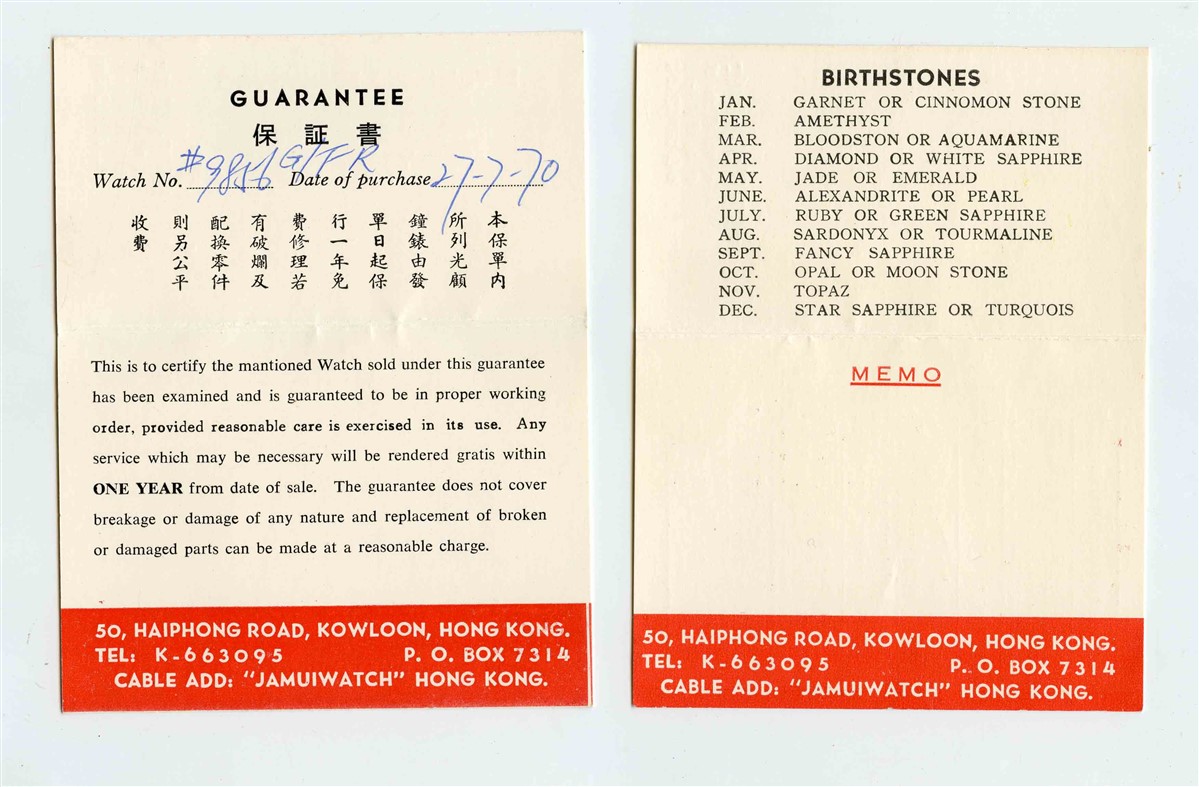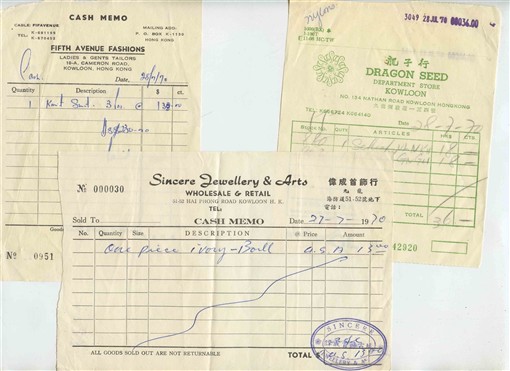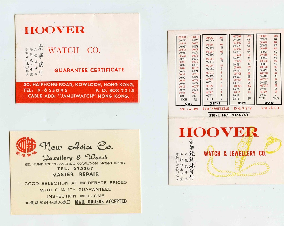 There are 8 different items in this lot, A Receipt from Tug Fai for a Watch, from Fifth Avenue Fashions for a shirt, from Dragon Seed for 2 items, from Sincere Jewellery for an ivory bowl, from Metro Tailors for a Suit, a business card from New Asia Company and 2 items form Hoover Watch and Jewellery, a Business card with Birthstones and Money conversion Table and a Guarantee Certificate.