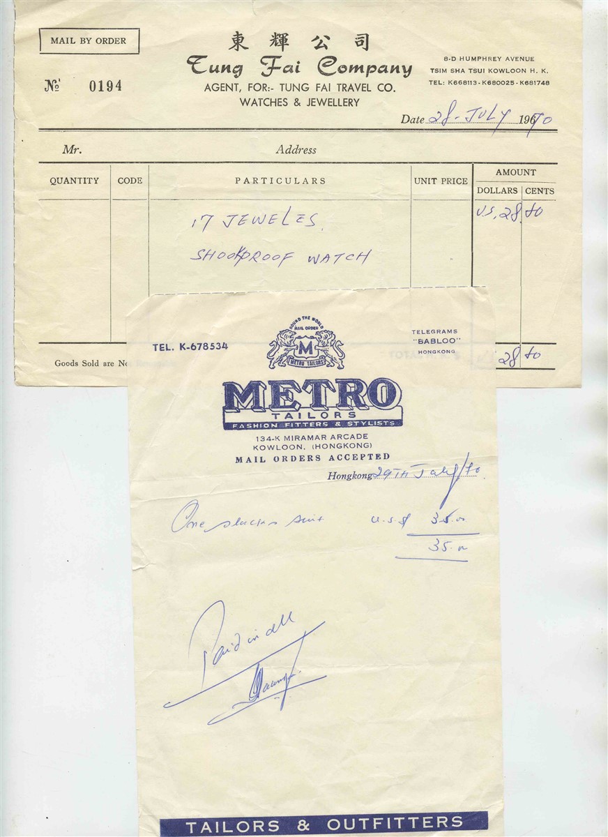 8 Hong Kong Receipts Watch Suit Shirt Bowl and Business & Guaranty Cards 1970