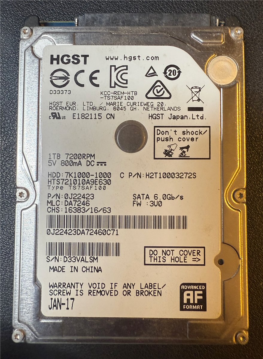 | Bezeichnung / Designation: | HGST, 1TB, 7K1000-1000, HTS721010A9E630, S/N: D33VALSM, SATA HDD | | Verwendung / Use: | Festplatte, intern | | Zeítraum (Datum) / Period (Date) | ca. nach 2017 | | Zustand / Status: | Der Artikel war bei uns in Betrieb. Das Gerät hat bis zum Schuß problemlos funktioniert ! |