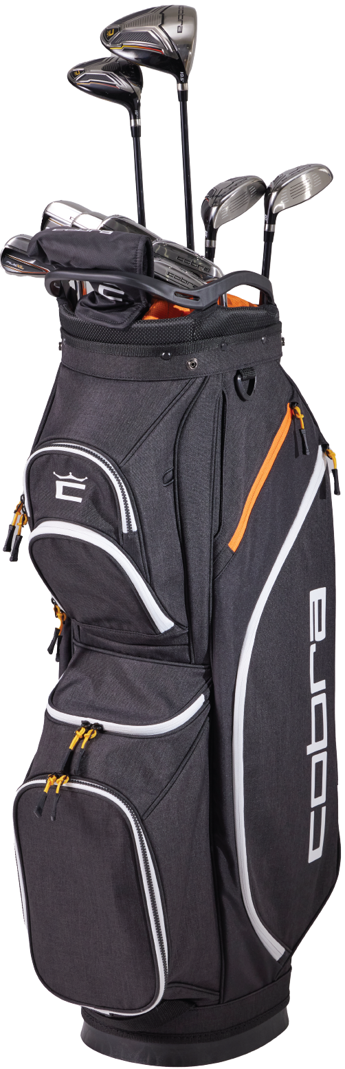 The Cobra Fly-XL complete set features lightweight and forgiving clubs that get the ball in the air easier and farther. A titanium driver with an oversized head shape and heel-biased weighting creates longer, straighter drives. The 3W is built with a shallow profile and heel-biased weighting to enhance downrange accuracy and distance from the tee or from the fairway. 3 and 4 hybrids offer ideal gapping for longer approach shots to the greens. Cavity back irons are constructed with perimeter weighting to generate easy launch and distance. A premium blade putter with a machined face offers exceptional feel and control on the greens. The set also includes a 14-way cart bag with a velour valuables pocket and 7 more zippered storage compartments.